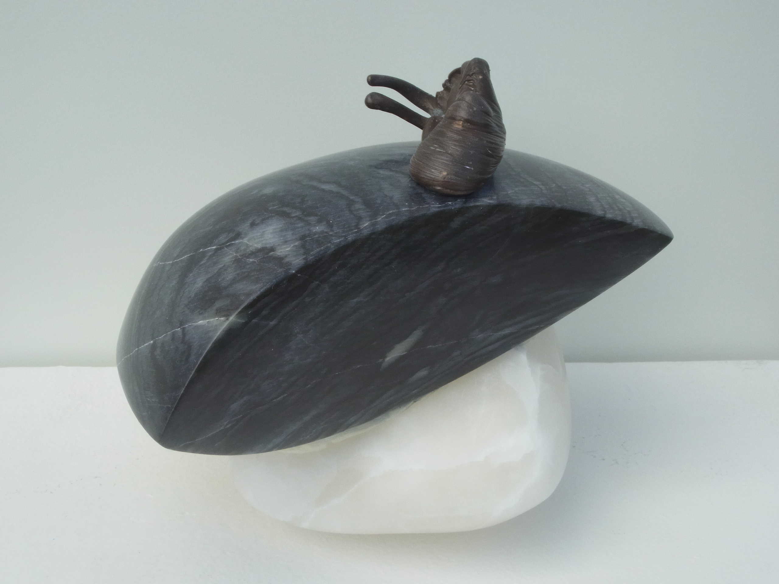 De balans is gevonden, Hierdoor stralt dit beeld van zwarte serpentijn en witte albast met een klein bronzen wezen veel rust uit..........The balance has been found. Therefore, this work of black serpentine and white alabaster with a smaal bronze creature, expresses a lot af tranquility.