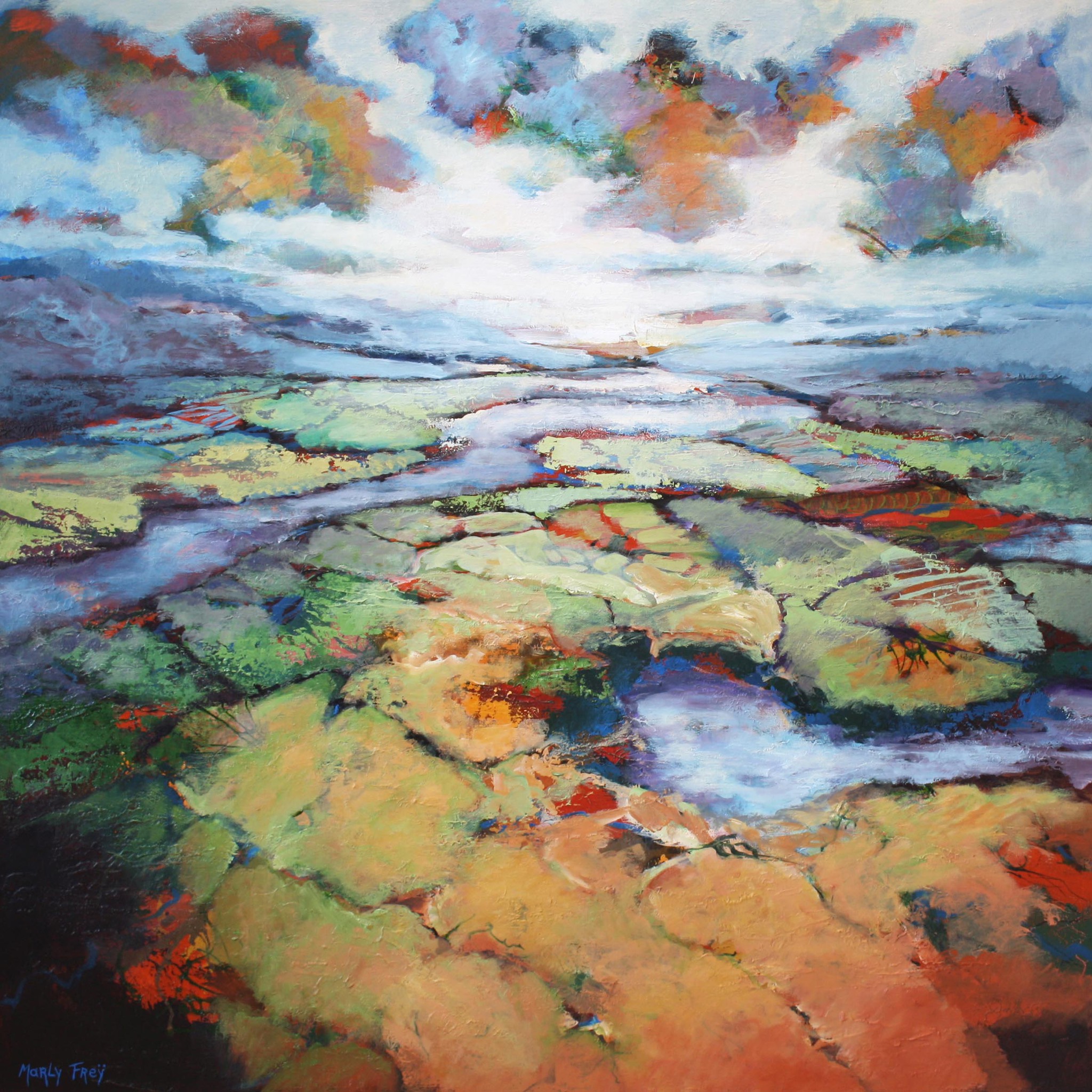 Marly Freij maakt grote kleurrijke, maar ook meer ingetogen schilderijen in gemengde techniek, met name sferische landschappen en abstracte composities