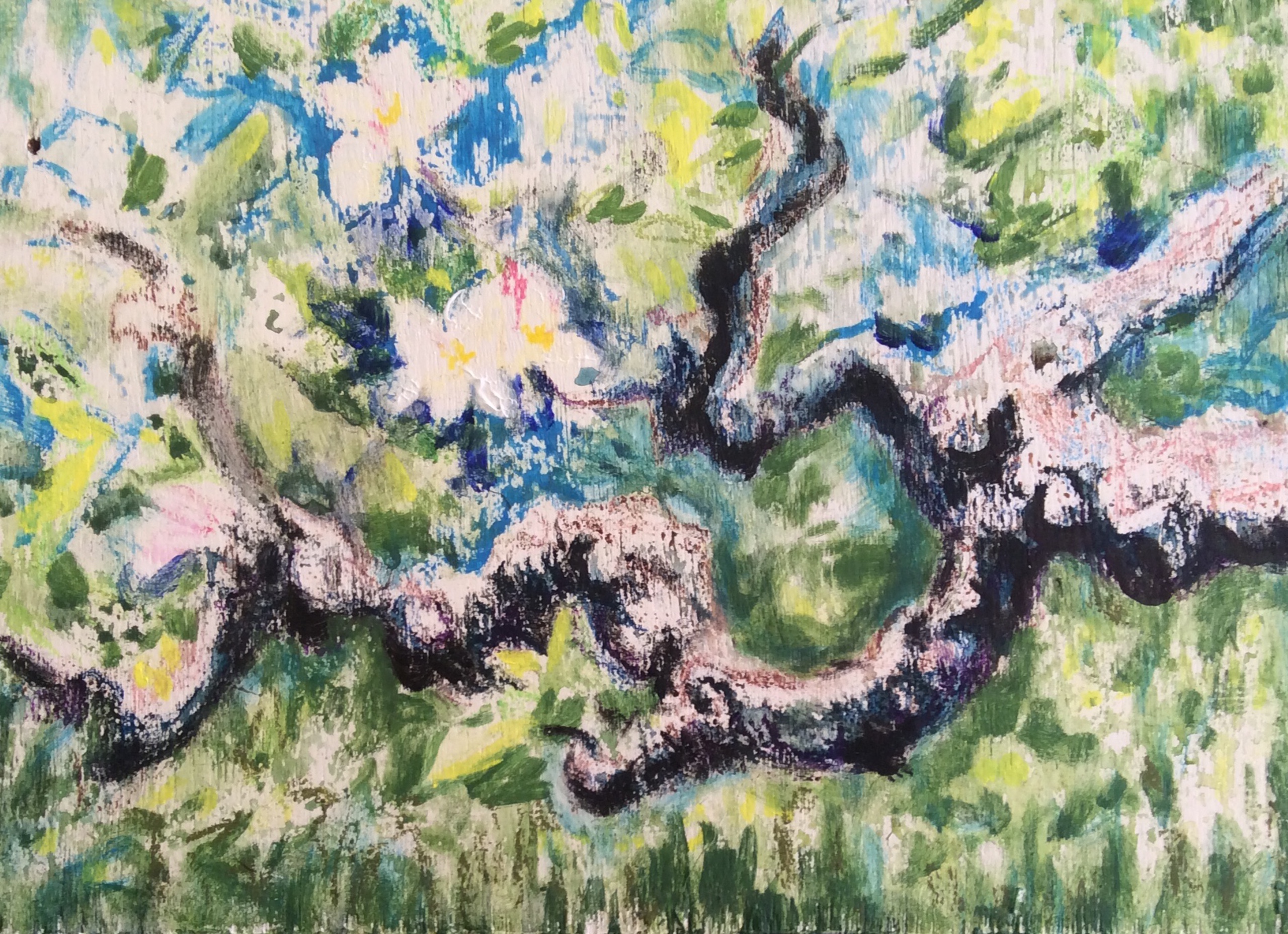 Tak oude appelboom in aquarel, oliekrijt en acryl op paneel.