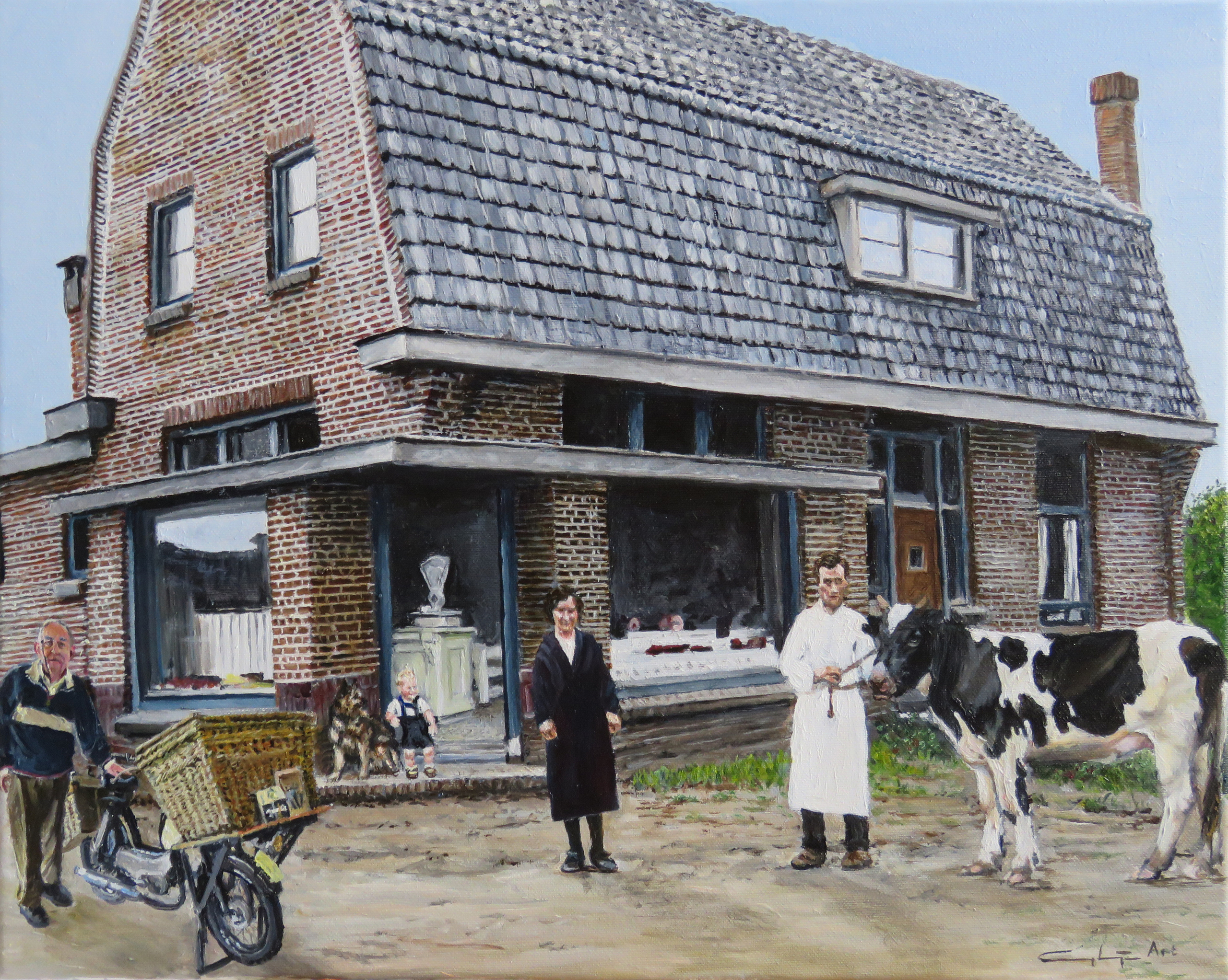 Omdat ik bij een slager kon exposeren en het de bedoeling was dat een relatie heeft tot de locatie. ben ik in de familiegeschiedenis gedoken. Ik bezocht een privé museum en leerde de gepensioneerde slager een beetje kennen. Thuis gekomen kwam ik op dit idee. Ik probeerde de geschiedenis een beetje naar het heden te halen.