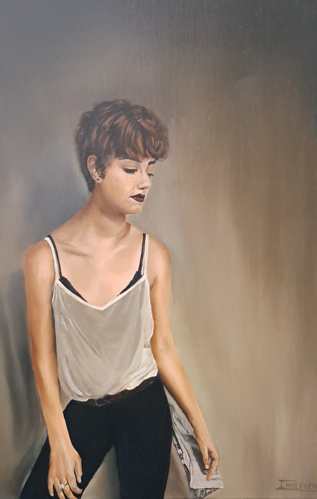 jonge vrouw in een schilderij met warme kleuren. olieverf op doek, 40 x 50