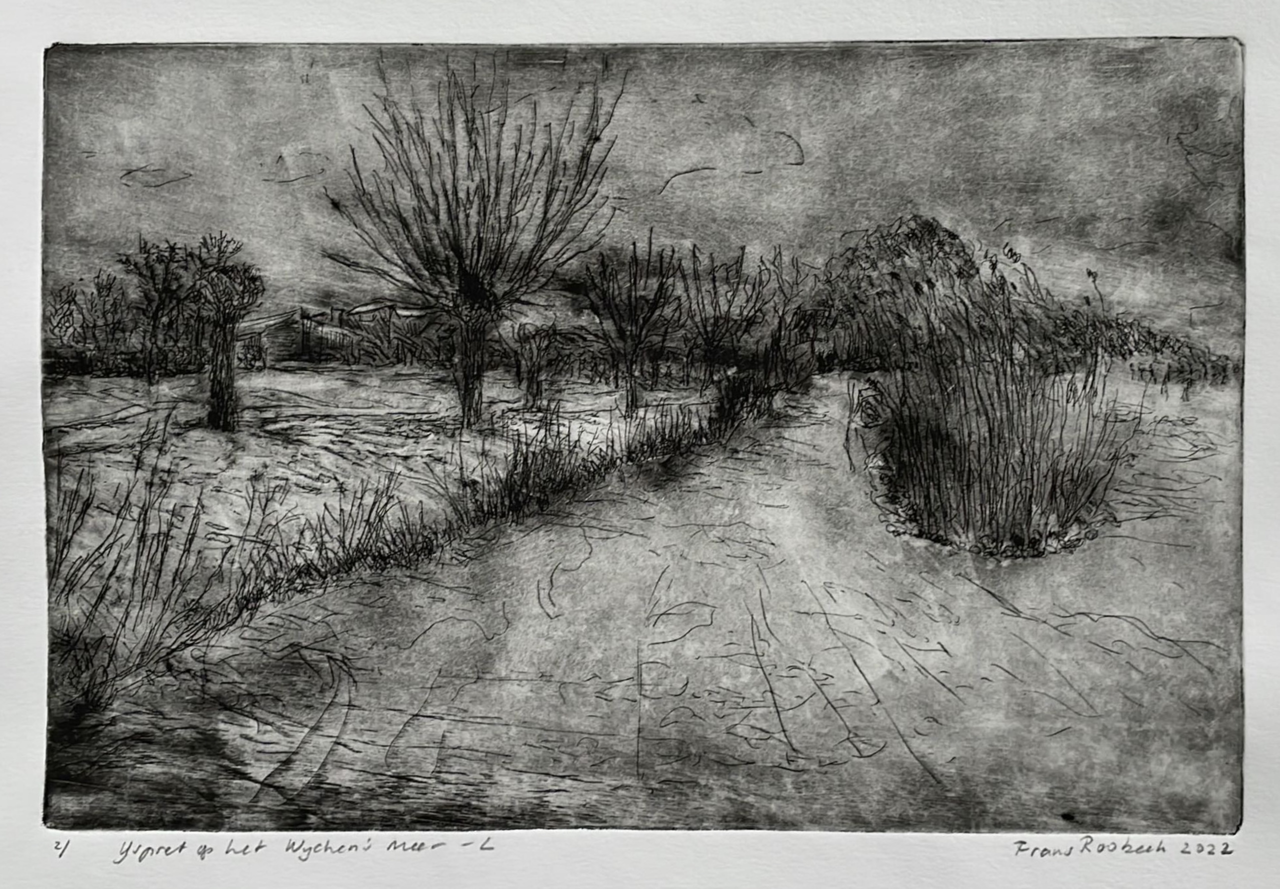 Deze ets is er een van een drieluik die gezamenlijk een panorama vormen van het Wijchen's meer in de winter, vanaf het ijs.