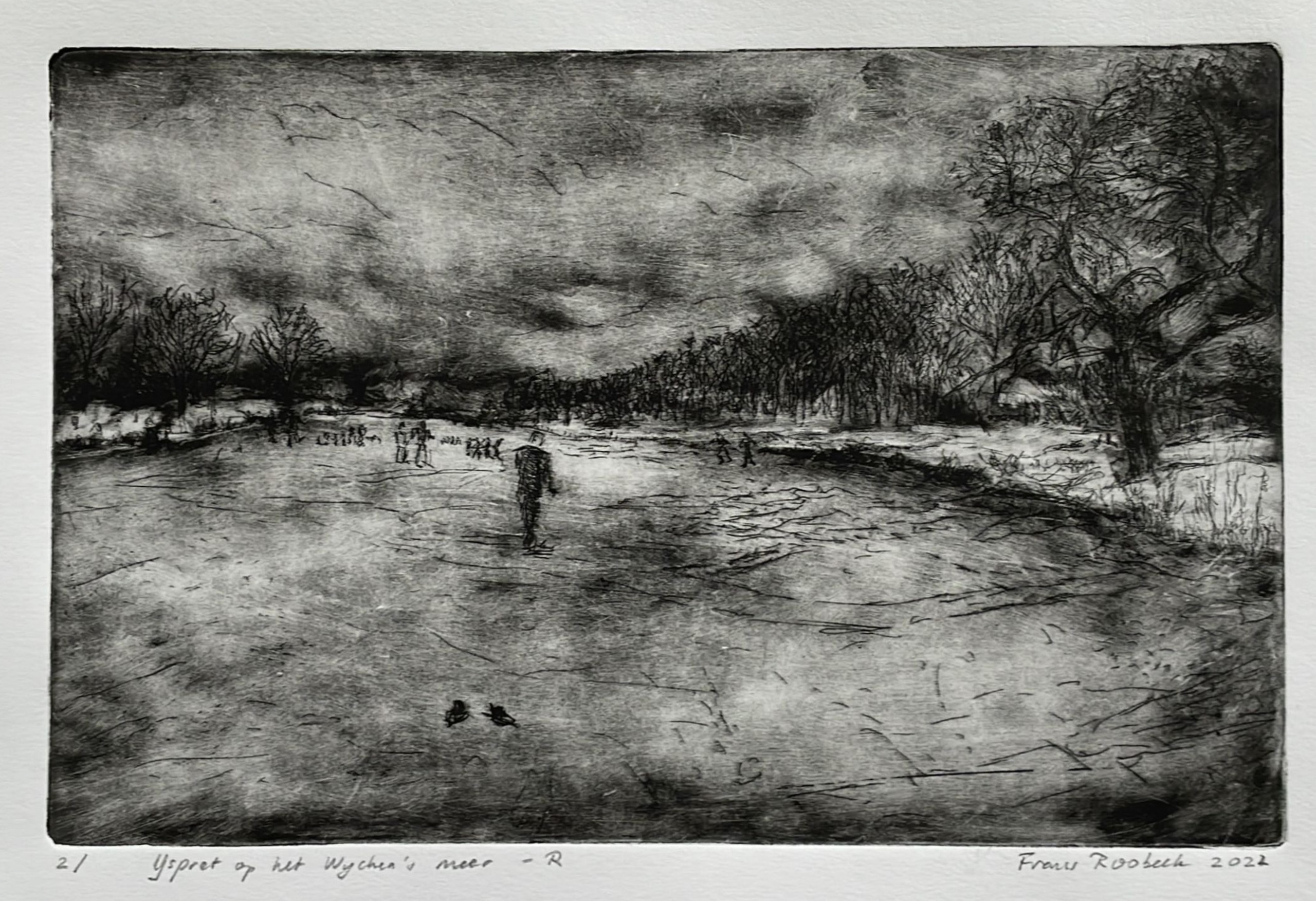 Deze ets is er een van een drieluik die gezamenlijk een panorama vormen van het Wijchen's meer in de winter, vanaf het ijs.