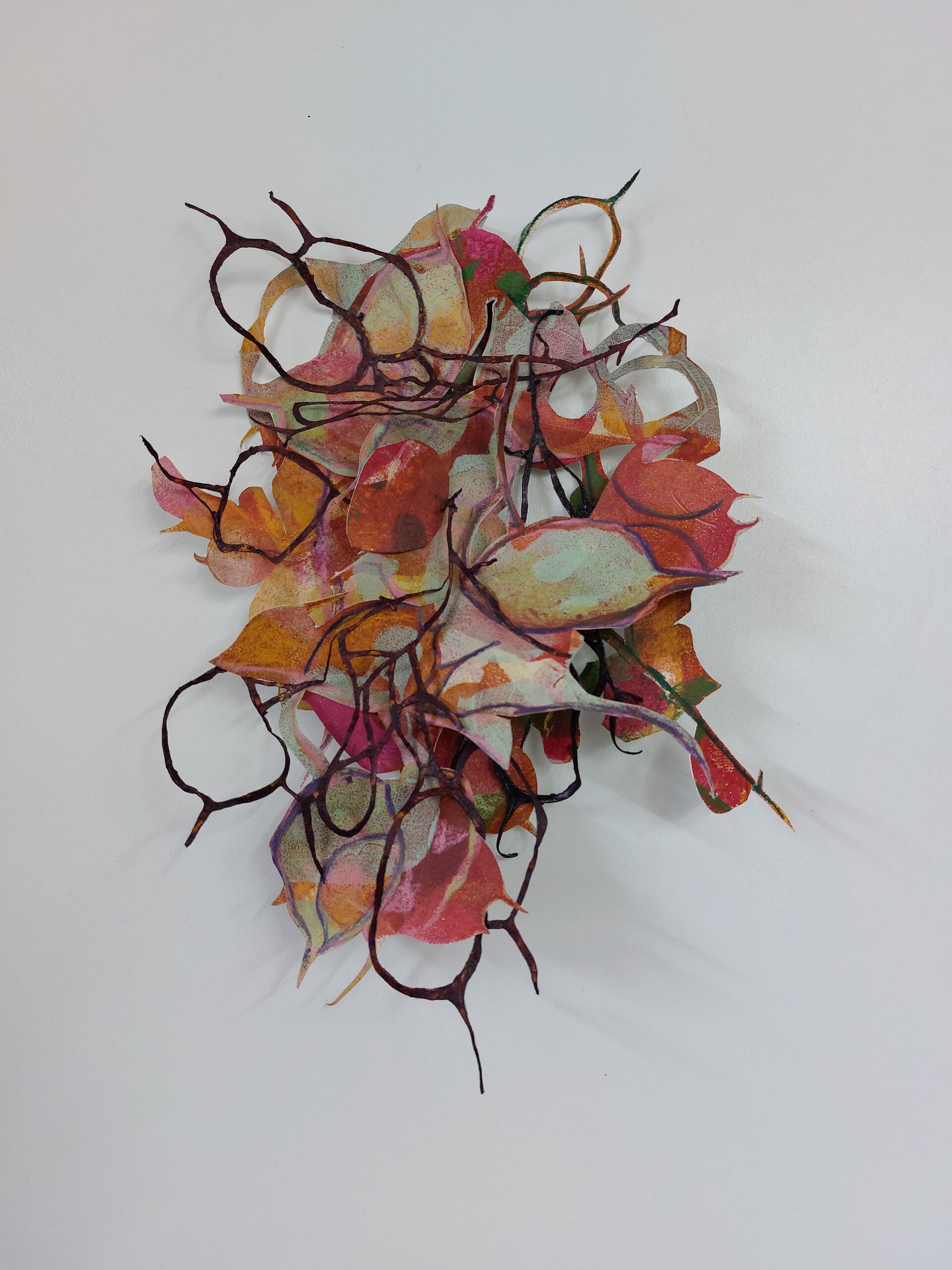 Natuurlijke vormen en patronen zijn het uitgangspunt voor ruimtelijke tekeningen en collages die zich los en speels over de muur verspreiden. Donkere stevige vormen, rond, ovaal, of als schaduwen, vaak gesneden uit karton, vormen een basis. Daarop en daaruit groeit bewerkt papier in allerlei vormen en structuren, heel organisch. Het papier is afwisselend fijn betekend of ruig bewerkt met krijt, inkt, verf, en met mes of schaar. In natuurlijke tinten, maar ook in zwart-wit, met soms juist een fel fluorescerend accent. Fijn als kant of filigraan, ruw als boomschors of een rotsblok. Het werk doet denken aan het lijnenspel van boomtakken, lianen, jonge loten van planten, levende organismen, cellen, of biologische en geologische structuren. Zoals in de natuur alles ontstaat, groeit en voortdur