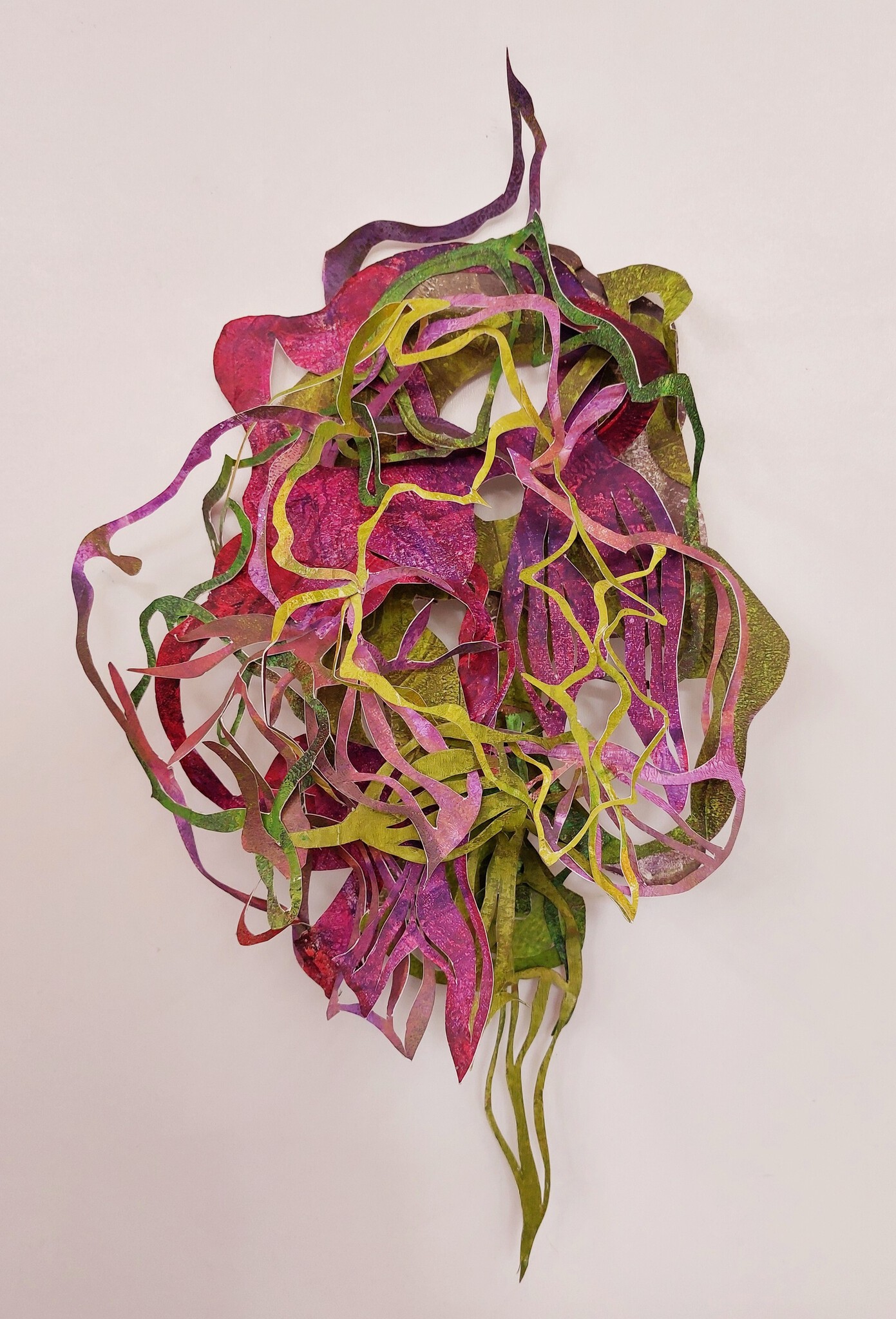 Natuurlijke vormen en patronen zijn het uitgangspunt voor ruimtelijke tekeningen en collages die zich los en speels over de muur verspreiden. Donkere stevige vormen, rond, ovaal, of als schaduwen, vaak gesneden uit karton, vormen een basis. Daarop en daaruit groeit bewerkt papier in allerlei vormen en structuren, heel organisch. Het papier is afwisselend fijn betekend of ruig bewerkt met krijt, inkt, verf, en met mes of schaar. In natuurlijke tinten, maar ook in zwart-wit, met soms juist een fel fluorescerend accent. Fijn als kant of filigraan, ruw als boomschors of een rotsblok. Het werk doet denken aan het lijnenspel van boomtakken, lianen, jonge loten van planten, levende organismen, cellen, of biologische en geologische structuren. Zoals in de natuur alles ontstaat, groeit en voortdur