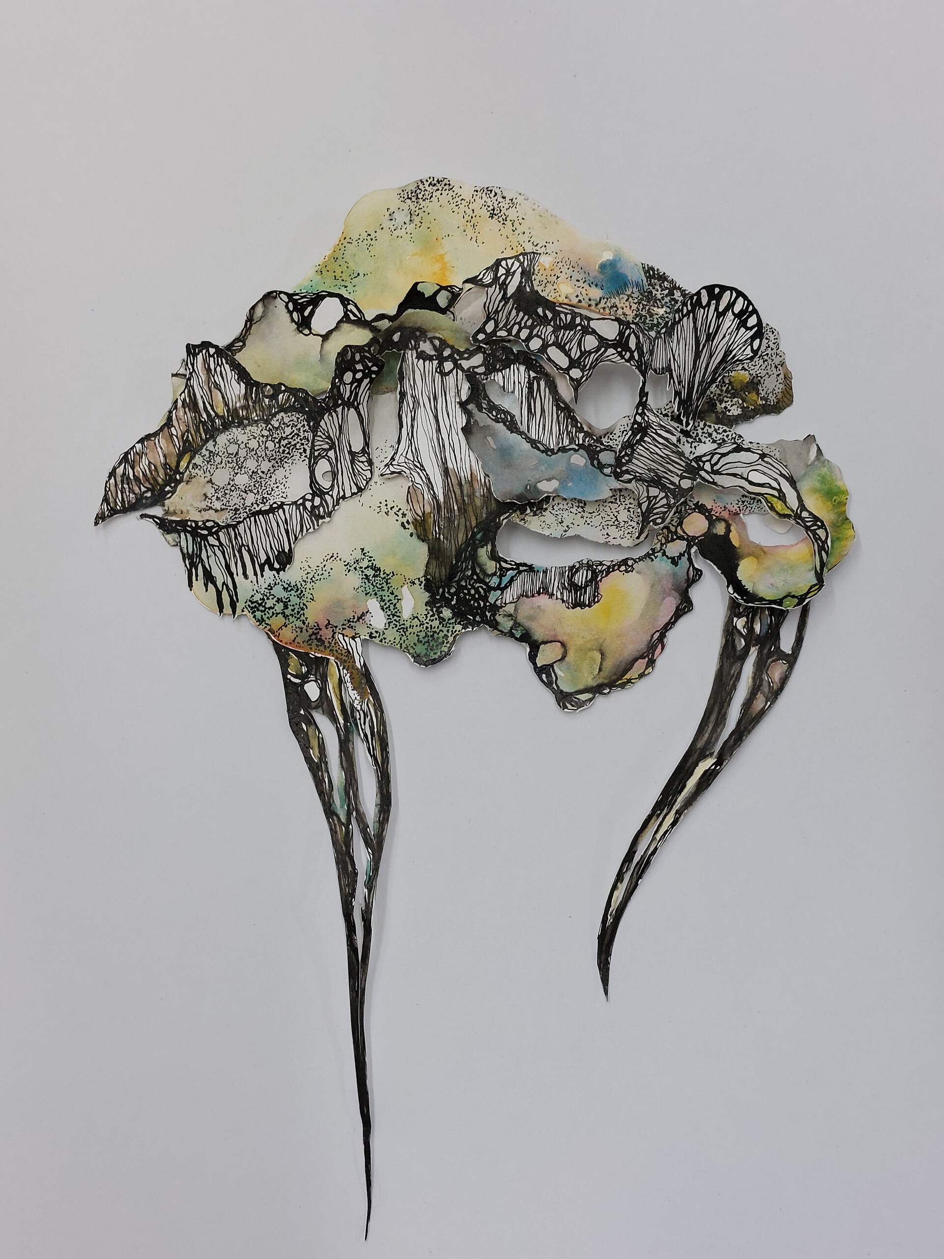 Natuurlijke vormen en patronen zijn het uitgangspunt voor ruimtelijke tekeningen en collages die zich los en speels over de muur verspreiden. Donkere stevige vormen, rond, ovaal, of als schaduwen, vaak gesneden uit karton, vormen een basis. Daarop en daaruit groeit bewerkt papier in allerlei vormen en structuren, heel organisch. Het papier is afwisselend fijn betekend of ruig bewerkt met krijt, inkt, verf, en met mes of schaar. In natuurlijke tinten, maar ook in zwart-wit, met soms juist een fel fluorescerend accent. Fijn als kant of filigraan, ruw als boomschors of een rotsblok. Het werk doet denken aan het lijnenspel van boomtakken, lianen, jonge loten van planten, levende organismen, cellen, of biologische en geologische structuren. Zoals in de natuur alles ontstaat, groeit en voortdur