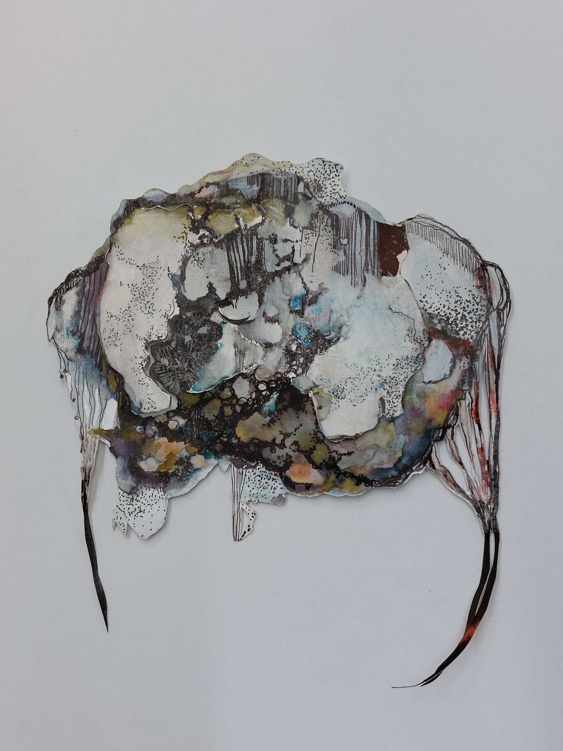 Ruimtelijke tekeningen en collages, geïnspireerd door alle organische vormen die de natuur rijk is, vormen nieuwe miniwerelden op zich.