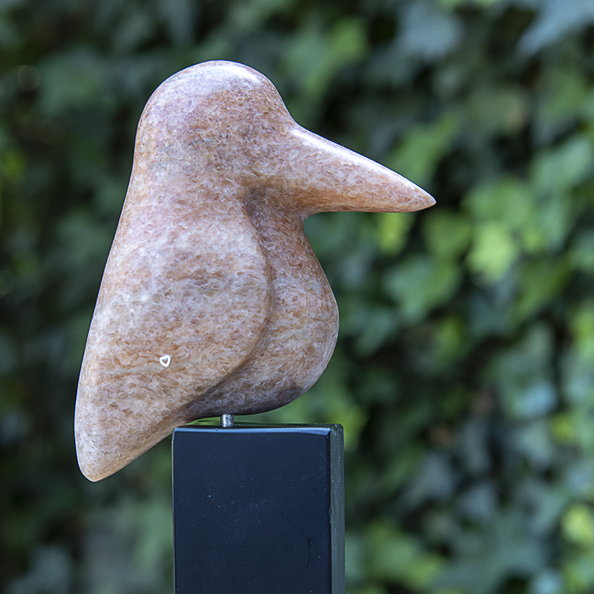oranje marmeren vogeltje op sokkel van zwart marmer.