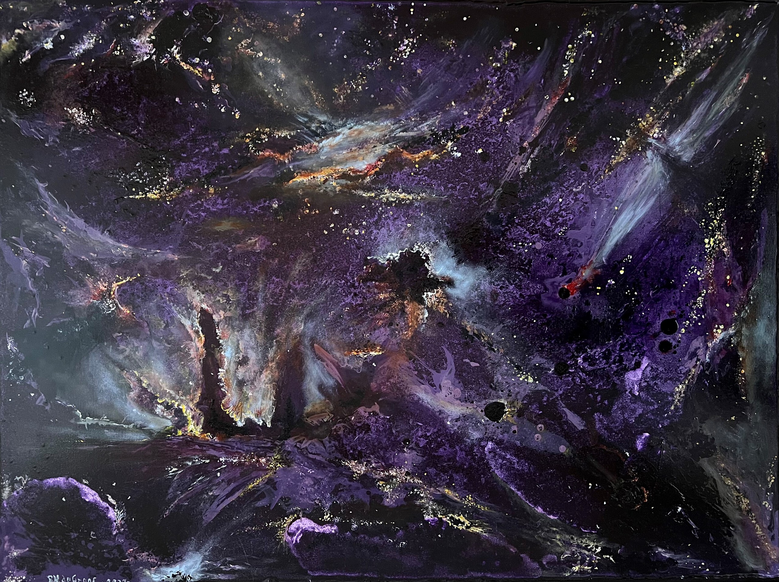'Een kijk in de ruimte' brengt alle facetten uit het heelal bij elkaar. Dit onstaat op zo'n manier uit mijn fantasie. Ik heb gebruik gemaakt van fijne schildertechnieken en geprobeerd extra veel diepte in het werk aan te brengen. Ik heb bewust voor de gewaagde kleur paars gekozen.