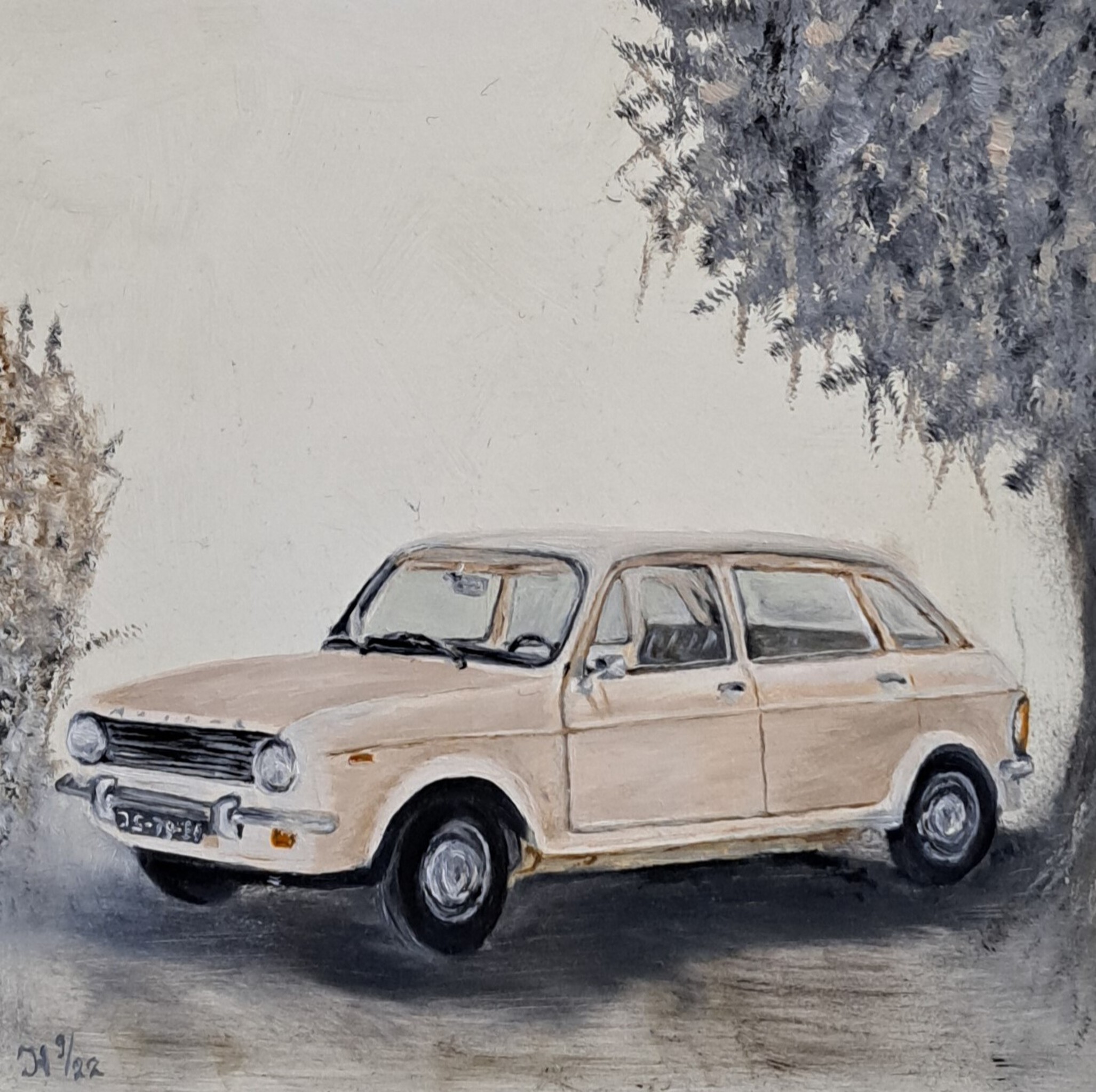 olieverf schilderijtje op muspaneel van een Austin Maxi