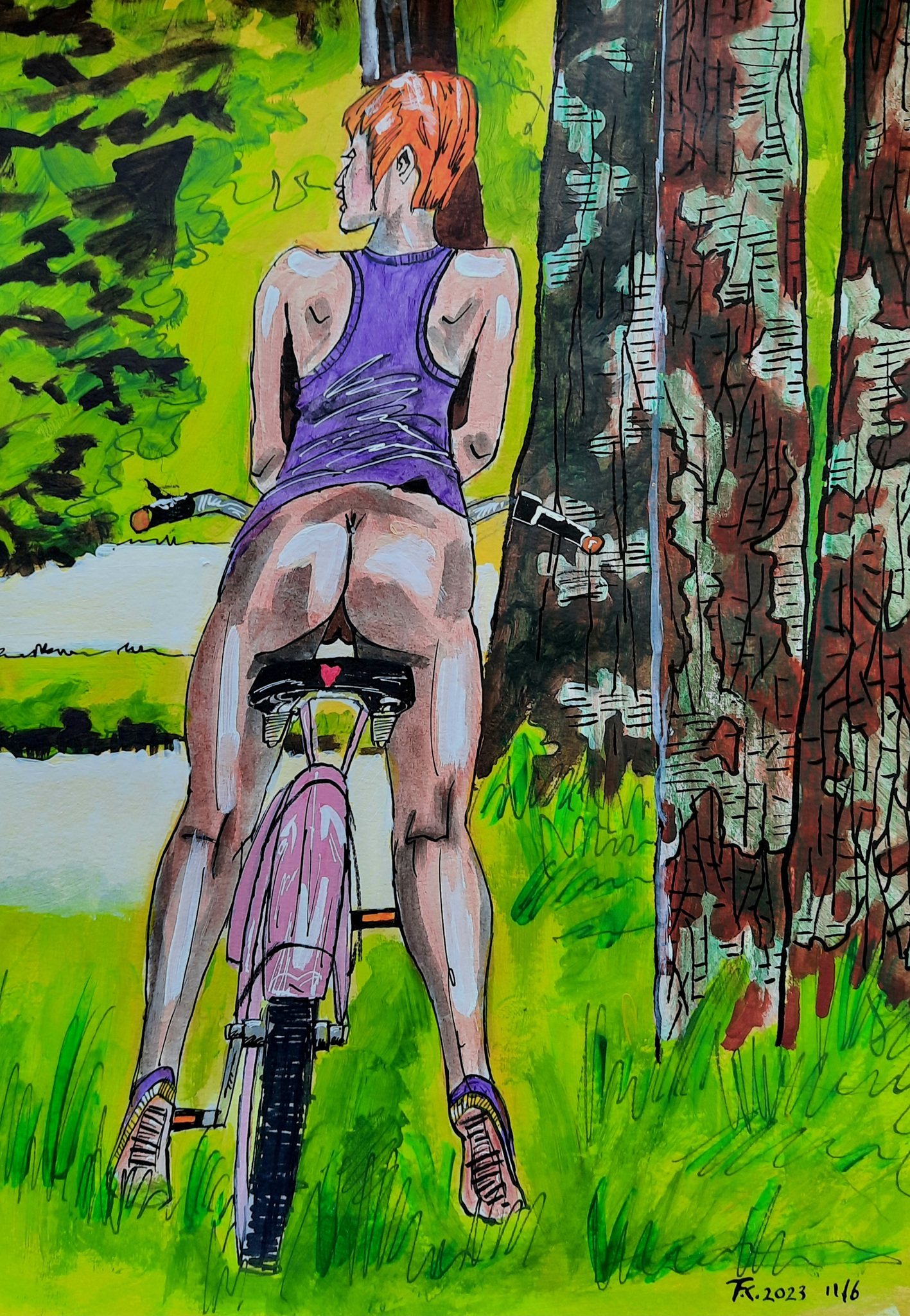Halfnaakt bosuitje op de fiets