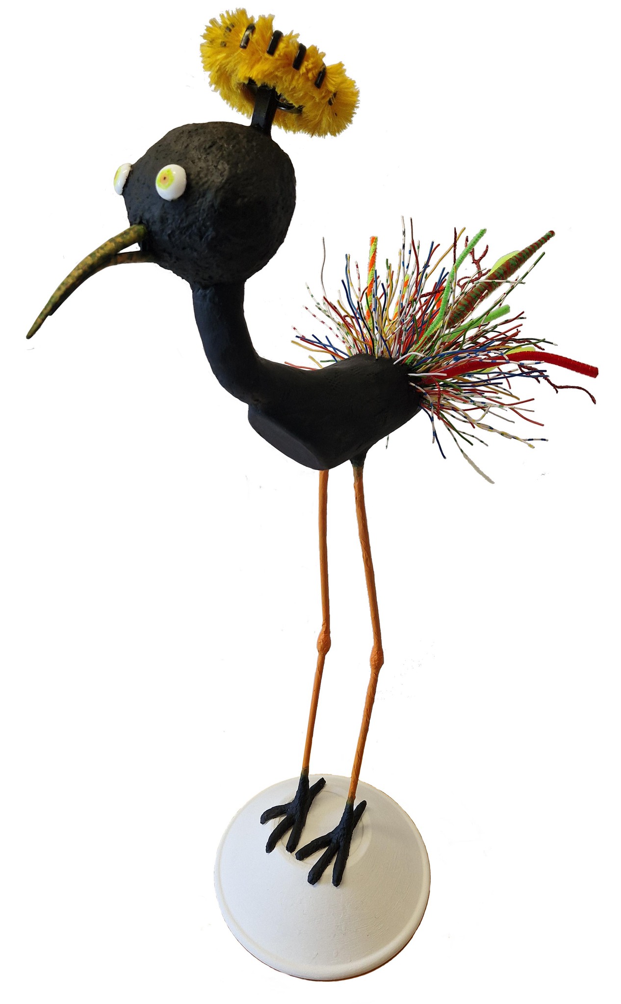 zwarte vogel deels van hout, deels van papiermaché, staart van electriciteitsbedrading
