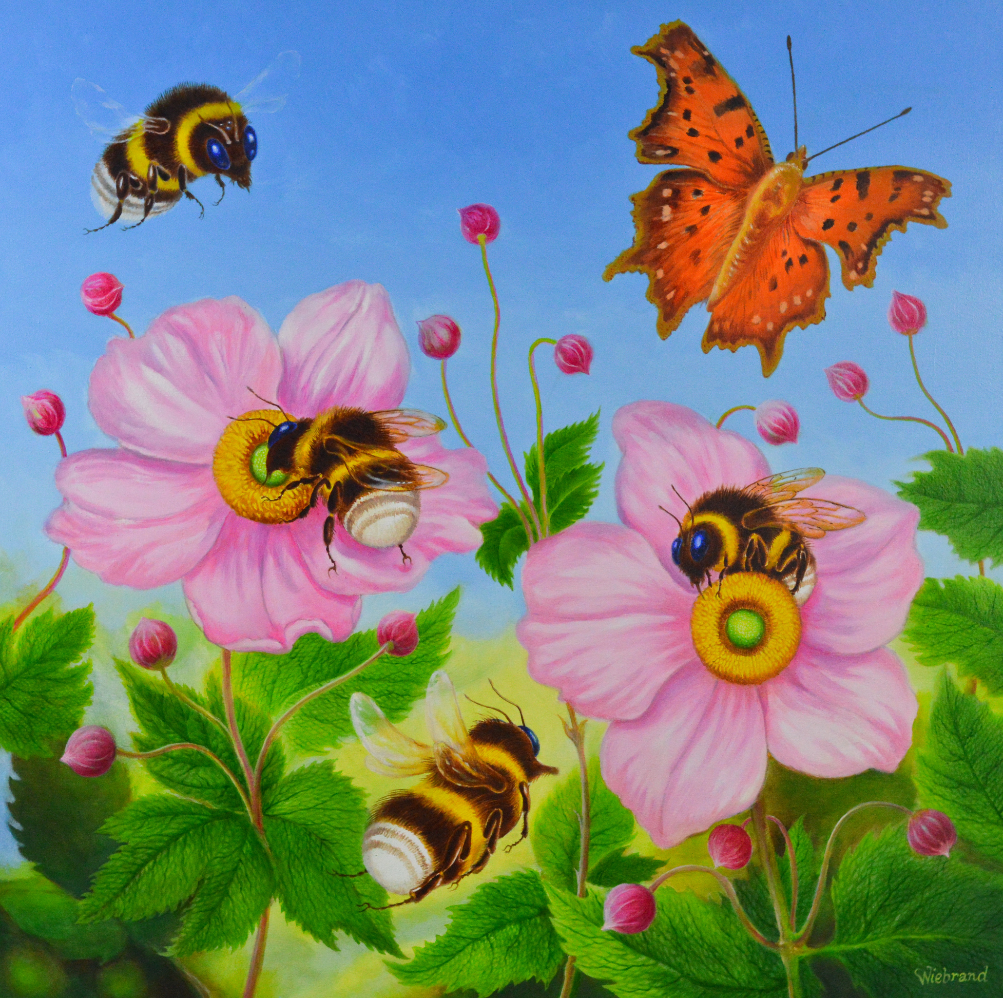 Hommels, vlinders, portretten, uitbundig bloeiende bloemen en levenslust zijn bij mij terugkerende thema’s. Soms overheerst de sereniteit, terwijl andere werken een dynamische indruk achterlaten. De boodschap die ik tracht uit te dragen is: vier het leven! De bloemen en insecten zijn rijkelijk aanwezig in mijn eigen tuin en directe omgeving. Zo zijn er meertjes, graslanden en zelfs een klein bos dichtbij. Al deze schoonheid vraagt om aandacht en verdiend het om geschilderd te worden.