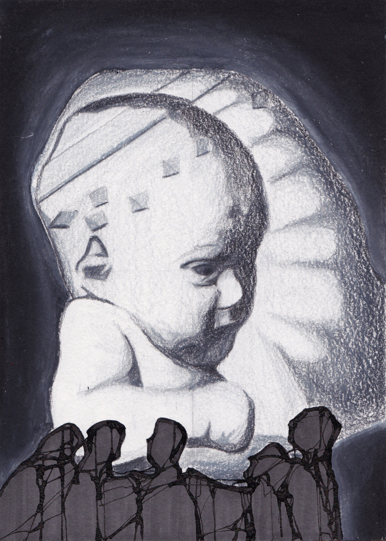 Beeld van baby, gebaseerd op een film still van een film die in 1958 vertoond werd in het Philips paviljoen van de wereld tentoonstelling in Brussel, ontworpen door Le Corbusier en Iannis Xenakis. De film vormt samen met een klankgedicht van Edgar Varèse een multimediale voorstelling, die volgens de kunstenaars toont hoe onze steeds sterker gemechaniseerde samenleving streeft naar een toekomstige nieuwe harmonie, wat begint bij de geboorte van een mens.