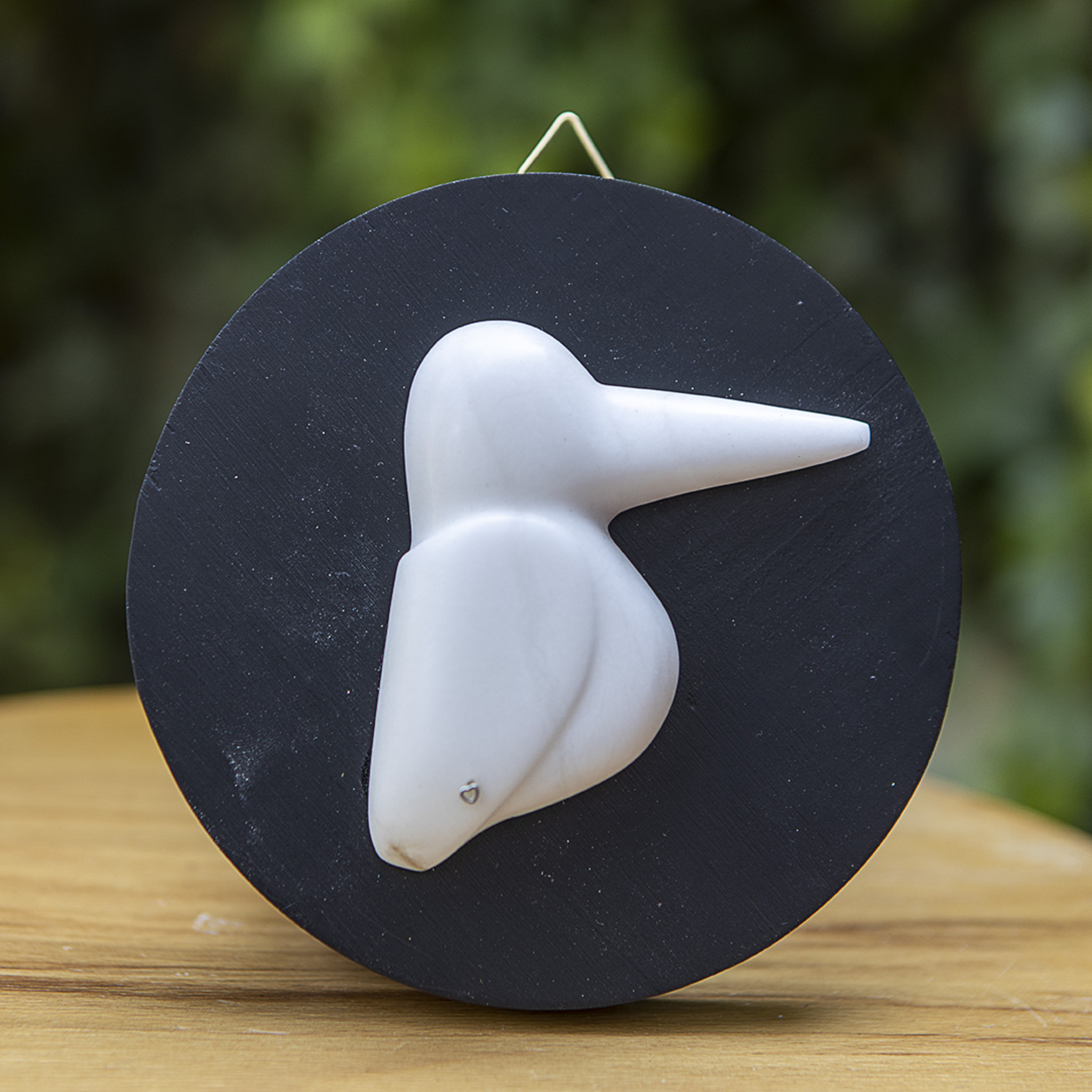 ronde plaquette met daarop een ijsvogeltje van witte albast.