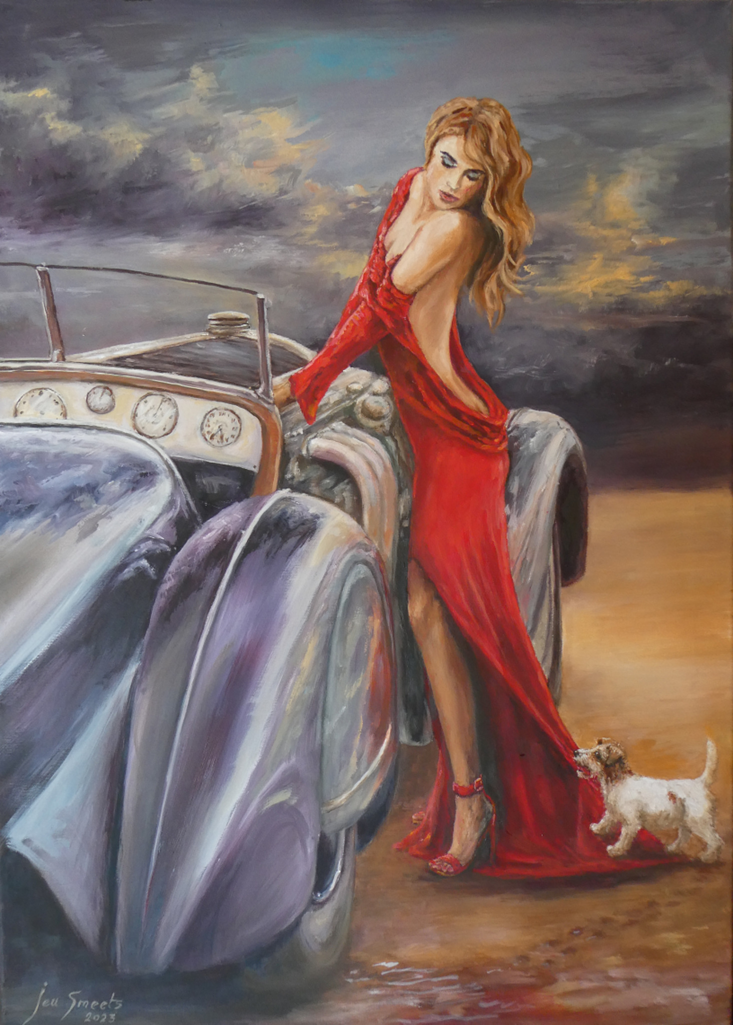 meisje in rode jurk ,met vintage Alfa Romeo en stiute Jack Russell