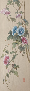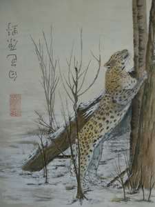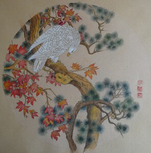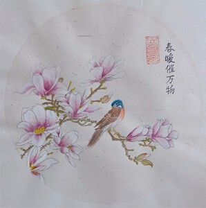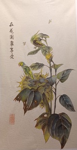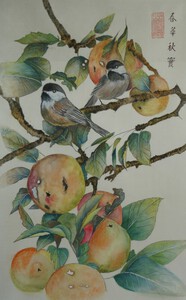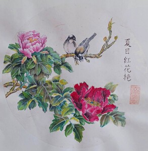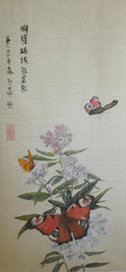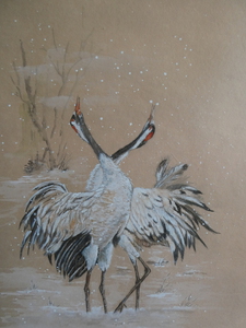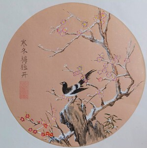 Contour techniek op chinees rijstpapier. De tekst hierbij luidt: Een koude winter doet de bloesem innig bloeien. Het rode stempel is mijn naam: Steur.