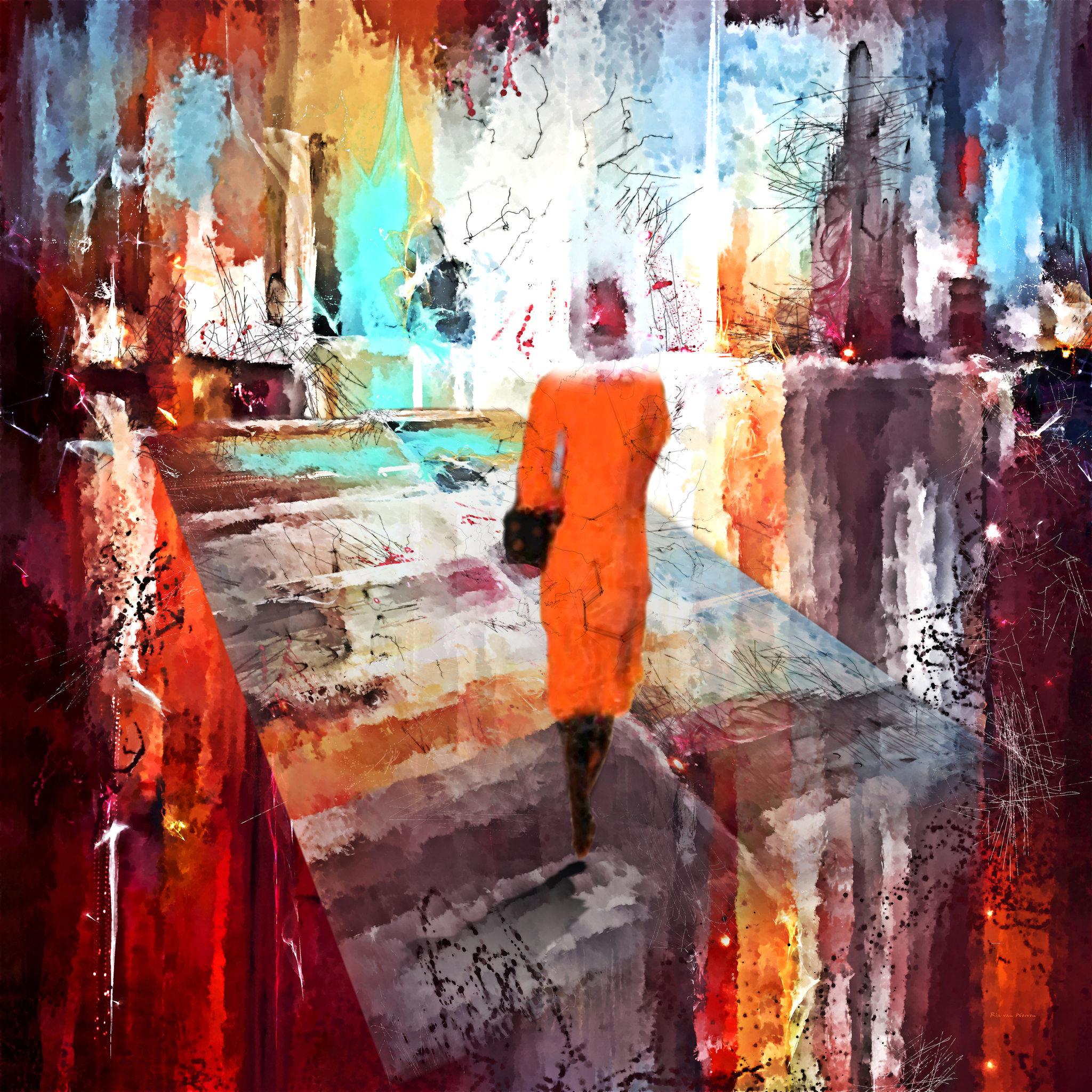 Gekleed In Oranje Jurk Japon Vrouw Landschap Abstract Blauw Rood Oranjepaars Wit Digital Art