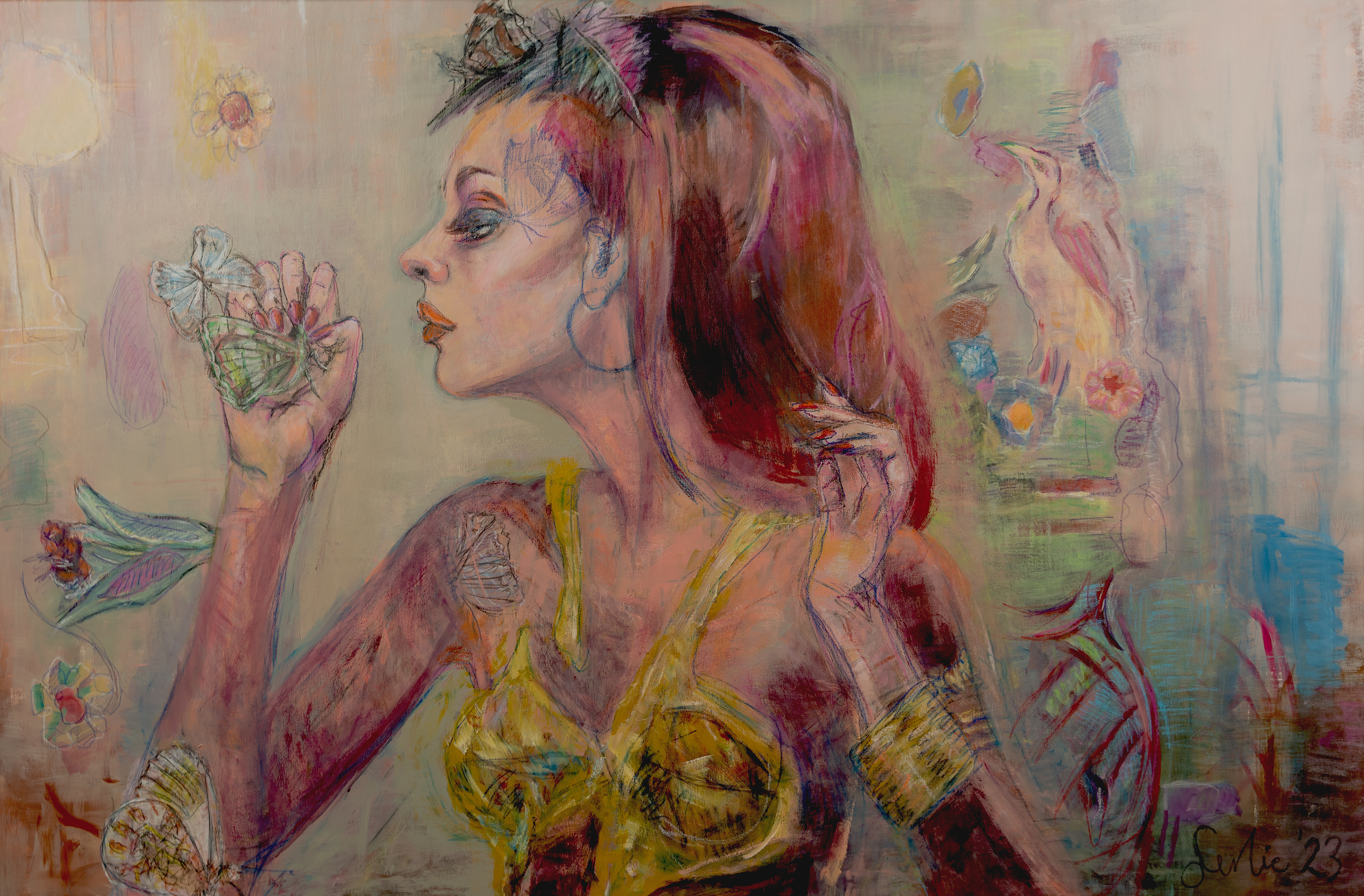 Schilderij Mensen Expressief Rustig Bloemen Vrouw Portret Vlinders Romantisch Sfeervol Woonkamer