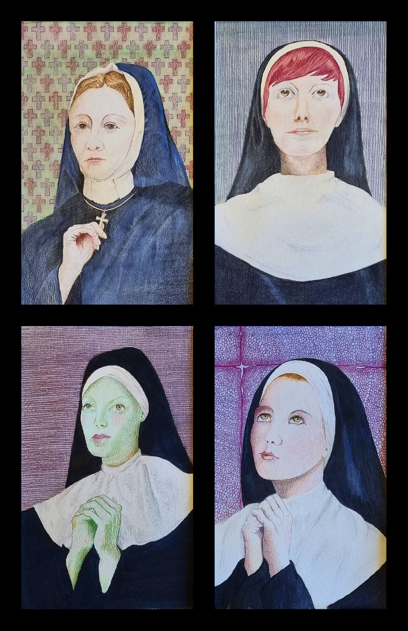 Viertal (ietwat vervreemde) nonnenportretjes gevat in een grijs passe-partout (50 x 70 cm). Kleurpotlood en aquareltehniek op Steinbach papier. De portretjes worden op de foto zonder passe-partout getoond en de vermelde afmetingen zijn die van de afzonderlijke portretjes.