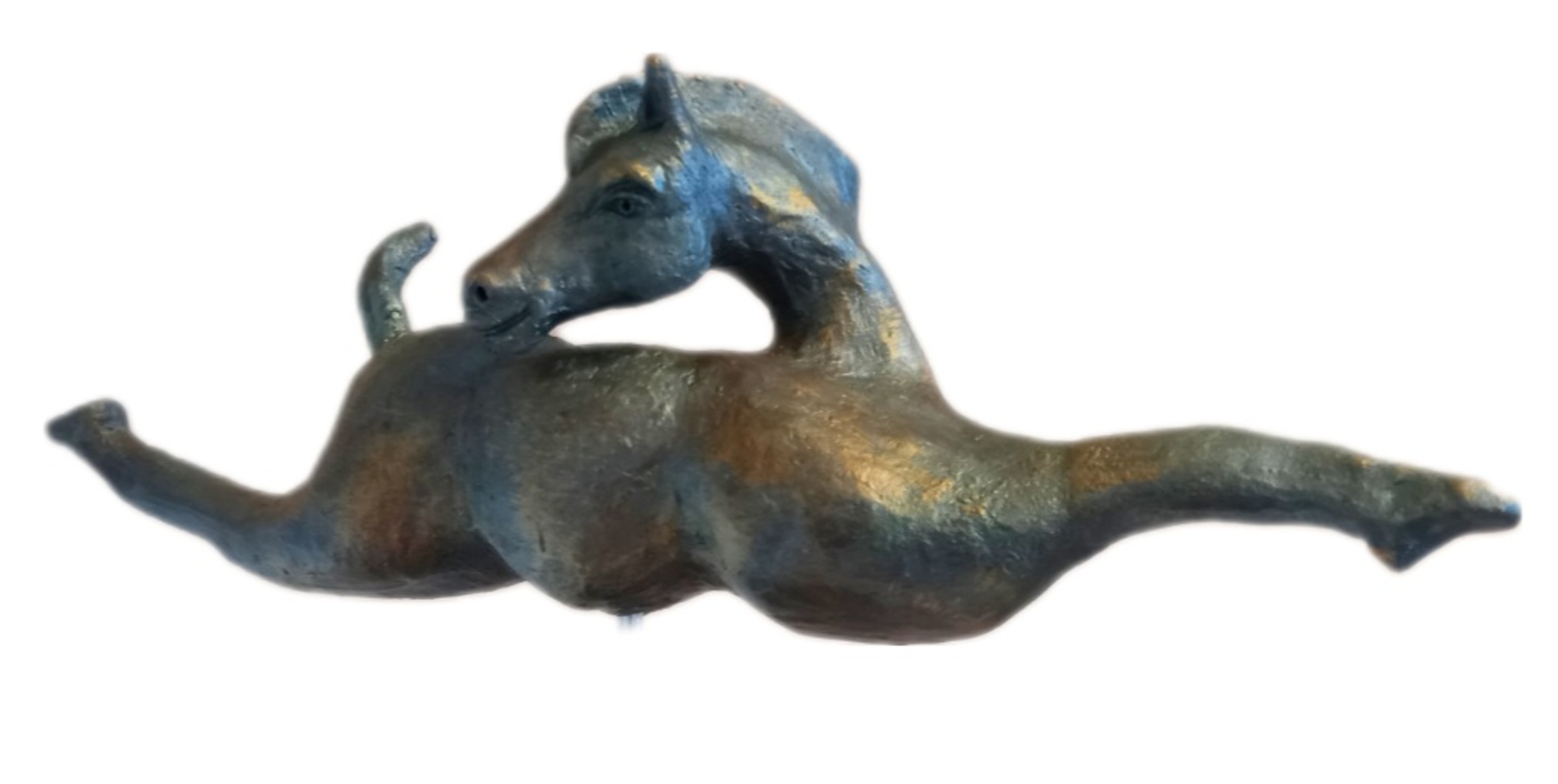 Paardendans Paard beeldje van zwart bakkende klei, bewerkt met acrylverf. Op een sokkel van hout met rvs-pin. Onderdeel van het paarden project