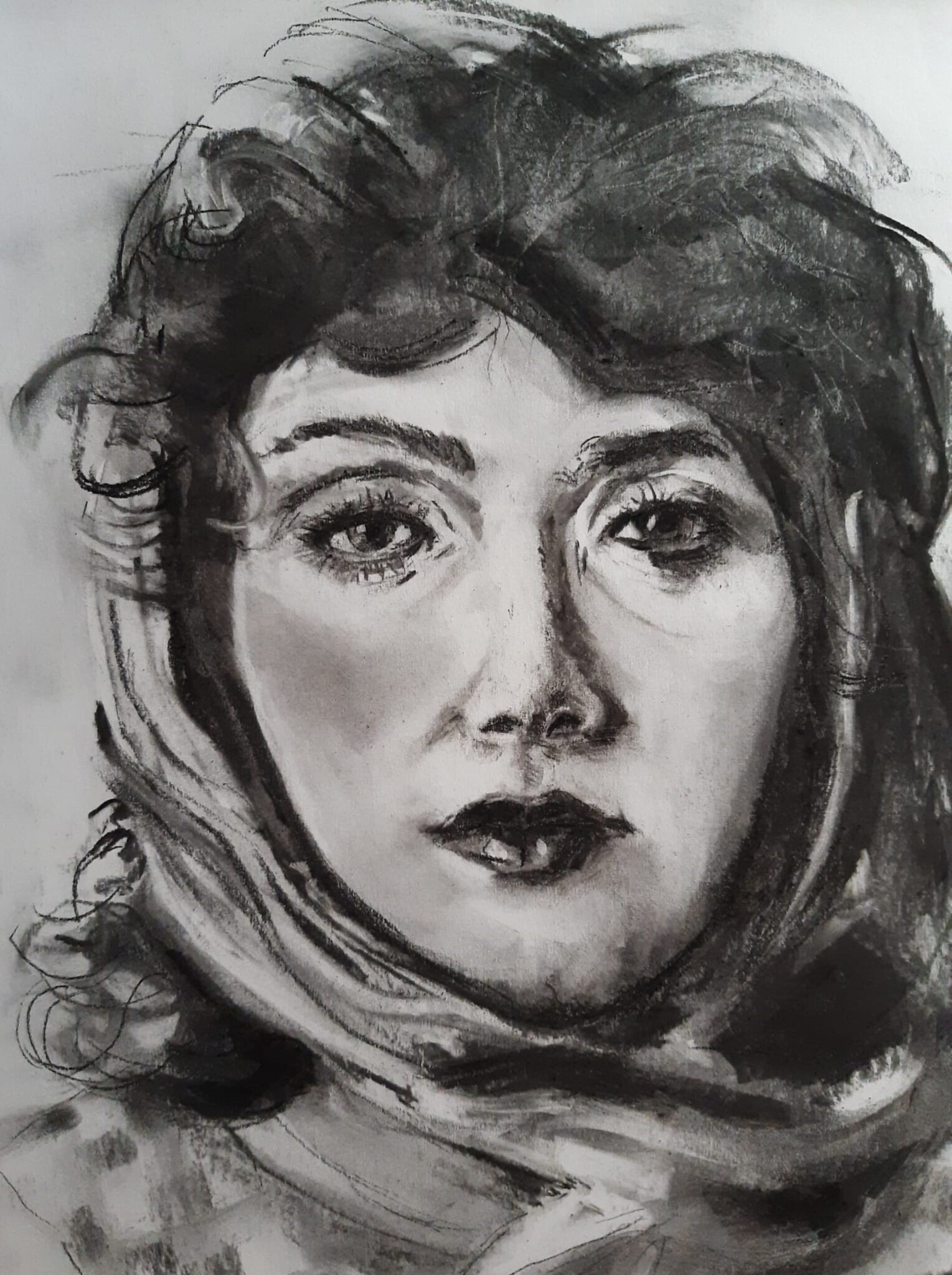 Houtskool op tekenpapier. Ik houd van houtskoolwerk. Dit voorjaar werkte ik aan serie portretten naar foto. Hier was de referentiefoto er een van een vrouw met een hoofddoek.Zoals wel vaker komen de gedachten en gevoelens bij een tekening (pas) al doende. Als het werk een tijdje ligt, kijk ik nog eens voor ik een titel bedenk. In dit geval legde ik het voor aan mensen online. De reacties waren verrassend divers. Waar de een dacht aan een zomerse bries (Summer breeze) kwam een ander met veel duisterder associaties.