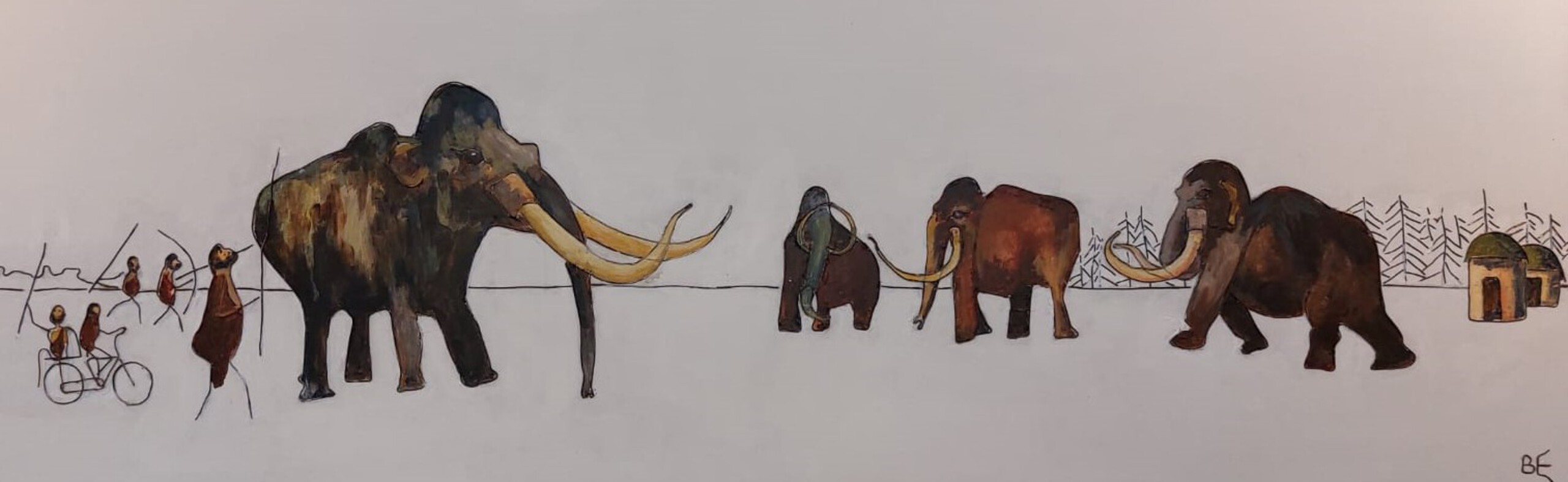 jacht tafereel in de oertijd op mammoets. acryl en ijzer draad op paneel