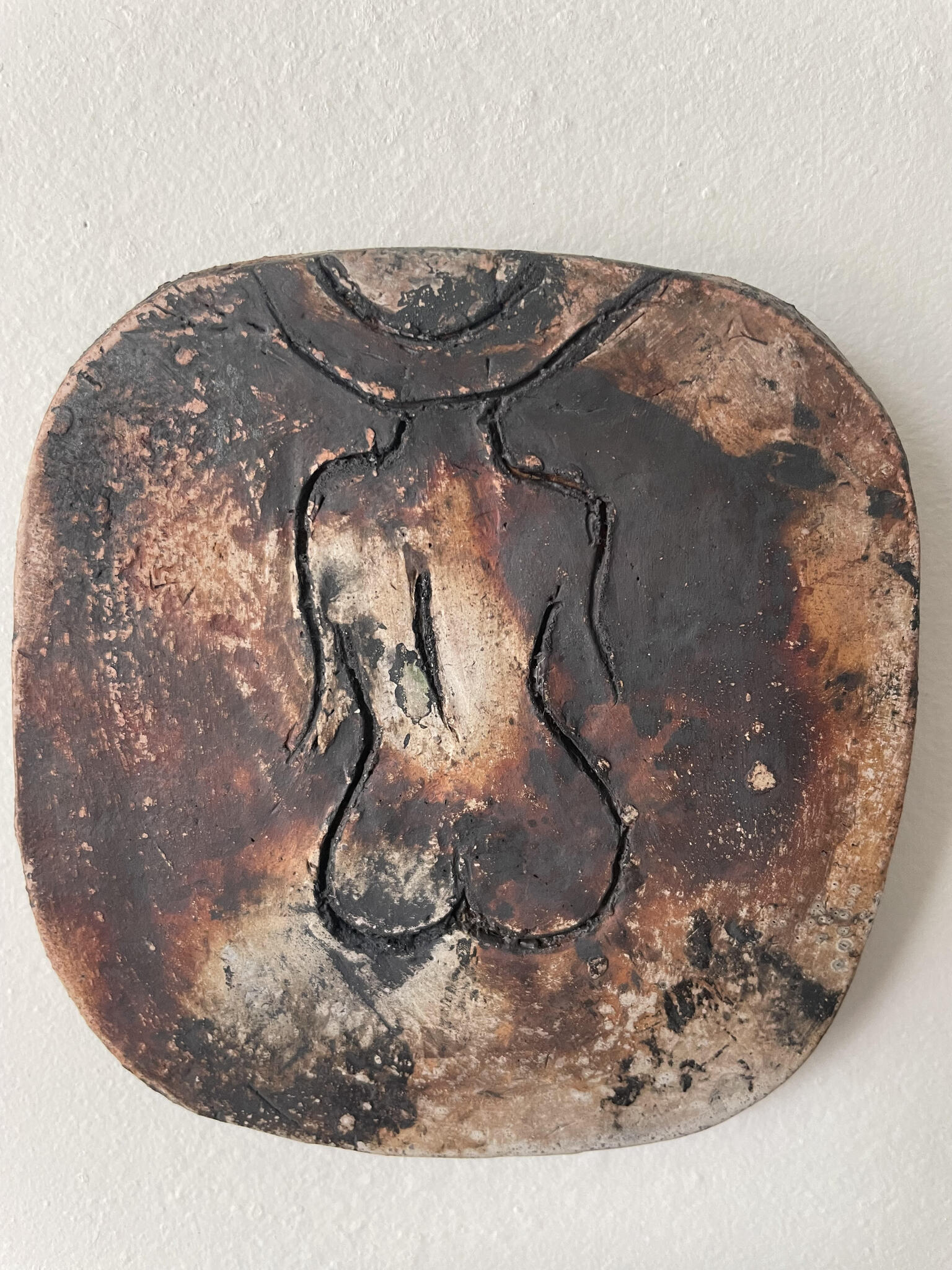 Aardewerk klei. Gestookt in de saggar pot met oxides en koperdraad.