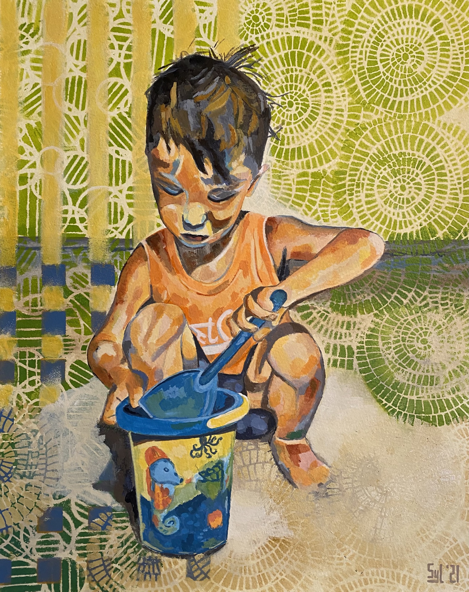 Sylvia van Beek (1967) schildert met acryl op doek of papier. Haar favoriete onderwerpen zijn mens en dier. Schildert bij "Collage Kunstcentrum Hoevelaken".