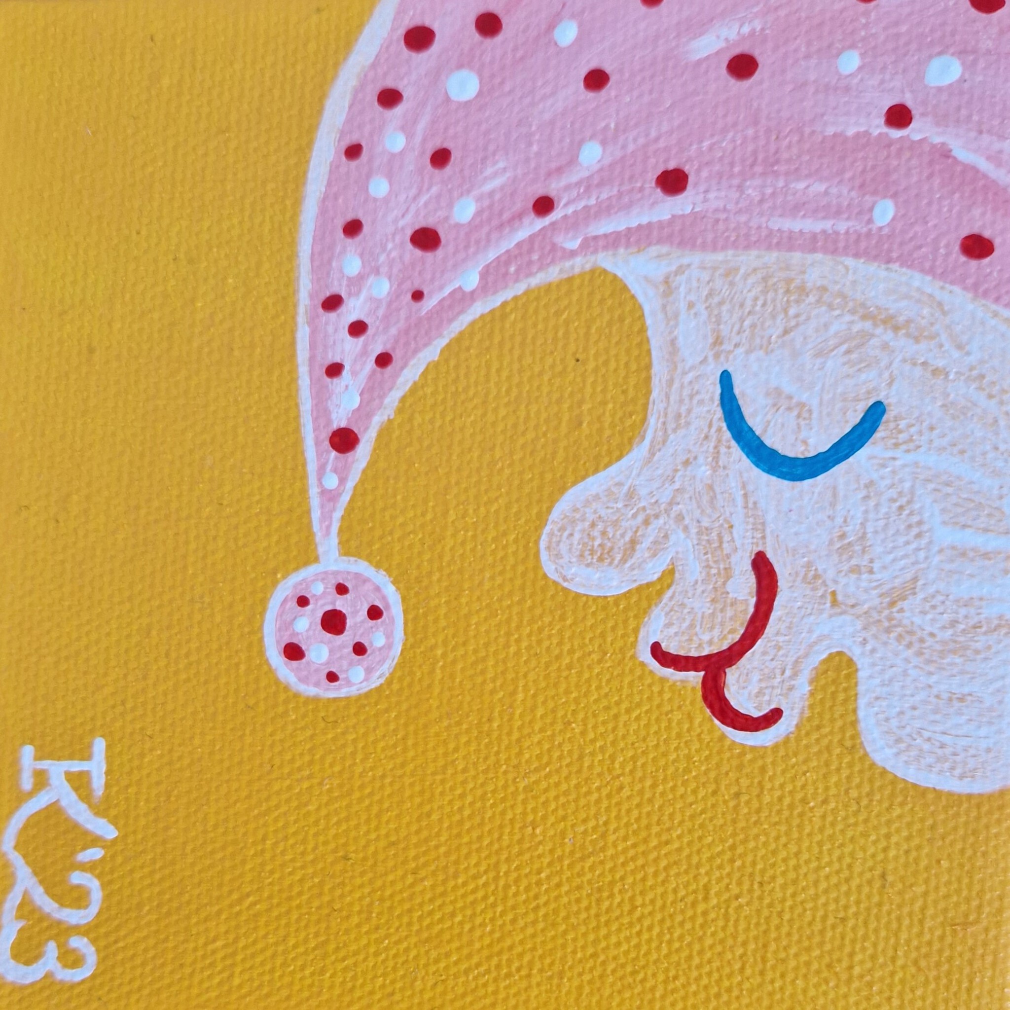 Acrylverf op katoen, 10 bij 10 cm, voorzien van haakjes en draad aan de achterkant, zodat je het schilderijtje makkelijk op kunt hangen. Pictoright. Als je je aanmeldt voor mijn nieuwsbrief, zie linksonder bij 'contact', krijg je 10% korting bij aanschaf van dit werk. De prijs is exclusief verzendkosten.