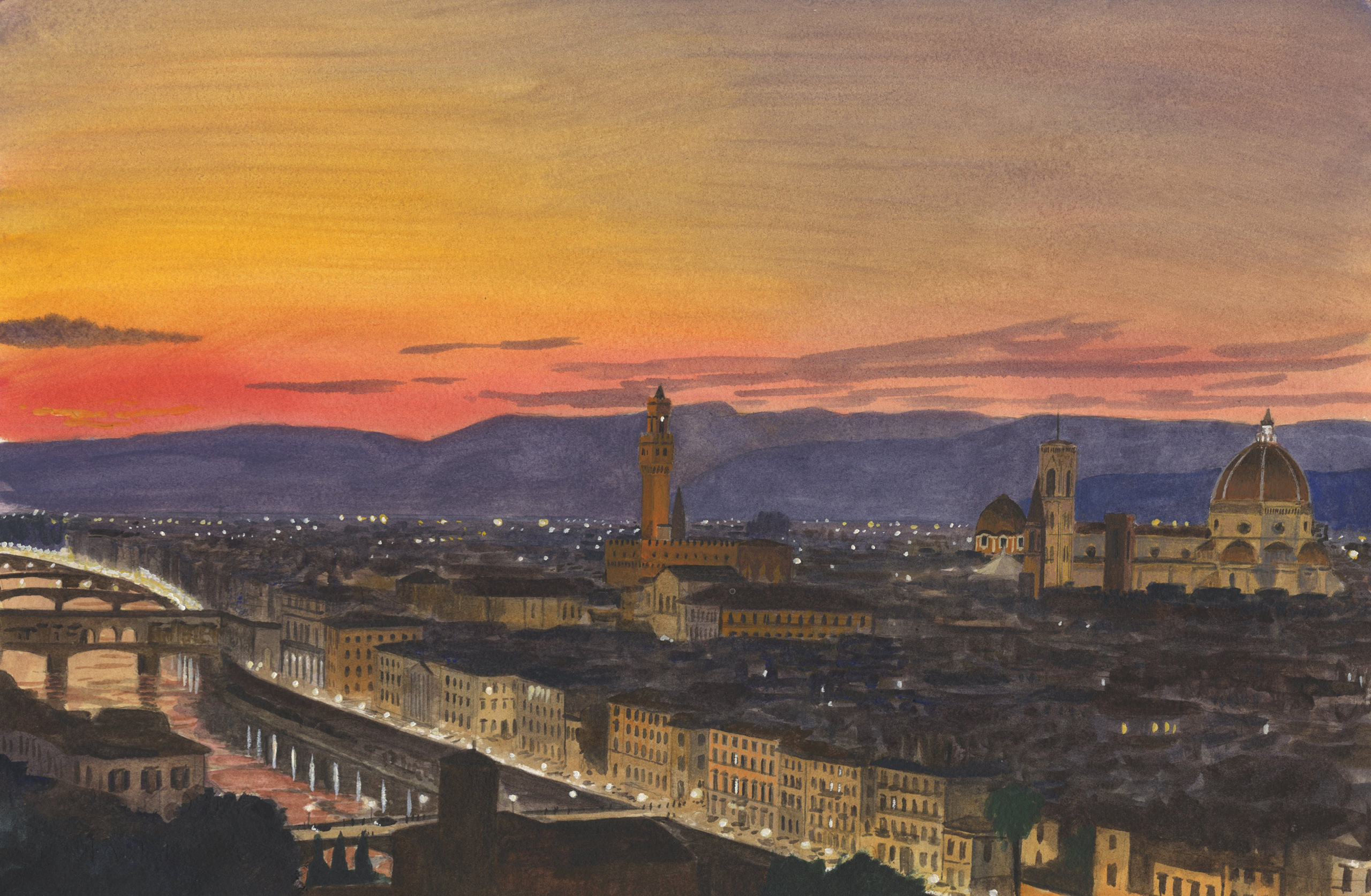Florence gezien vanaf de Piazzale Michelangelo bij schemering. Dit werk is in zijn geheel op locatie gemaakt.