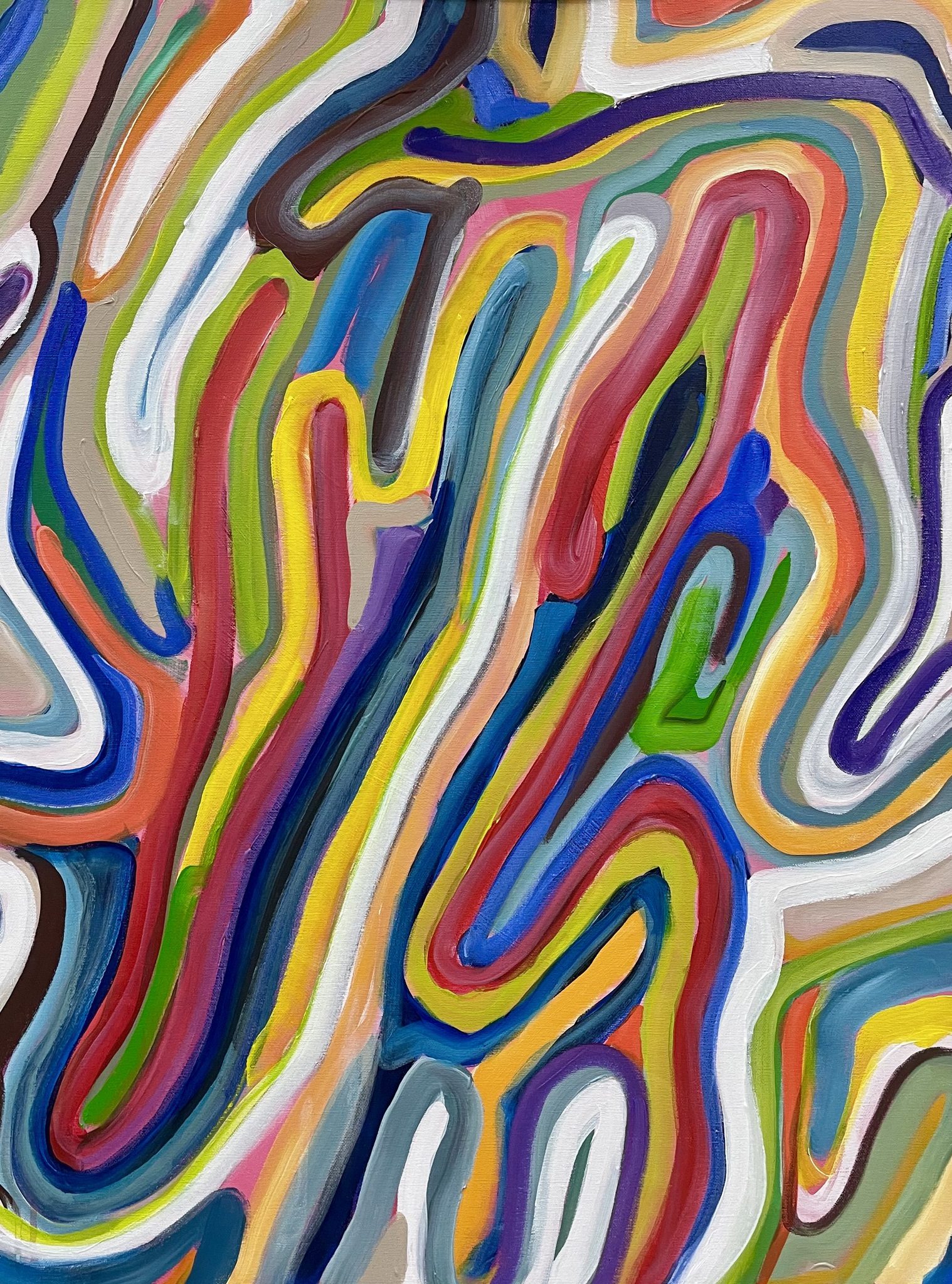 Een foto in NRC magazine over kunst in textiel inspireerde mij om dit werk te maken. Het is mixed media, olieverf en acryl.