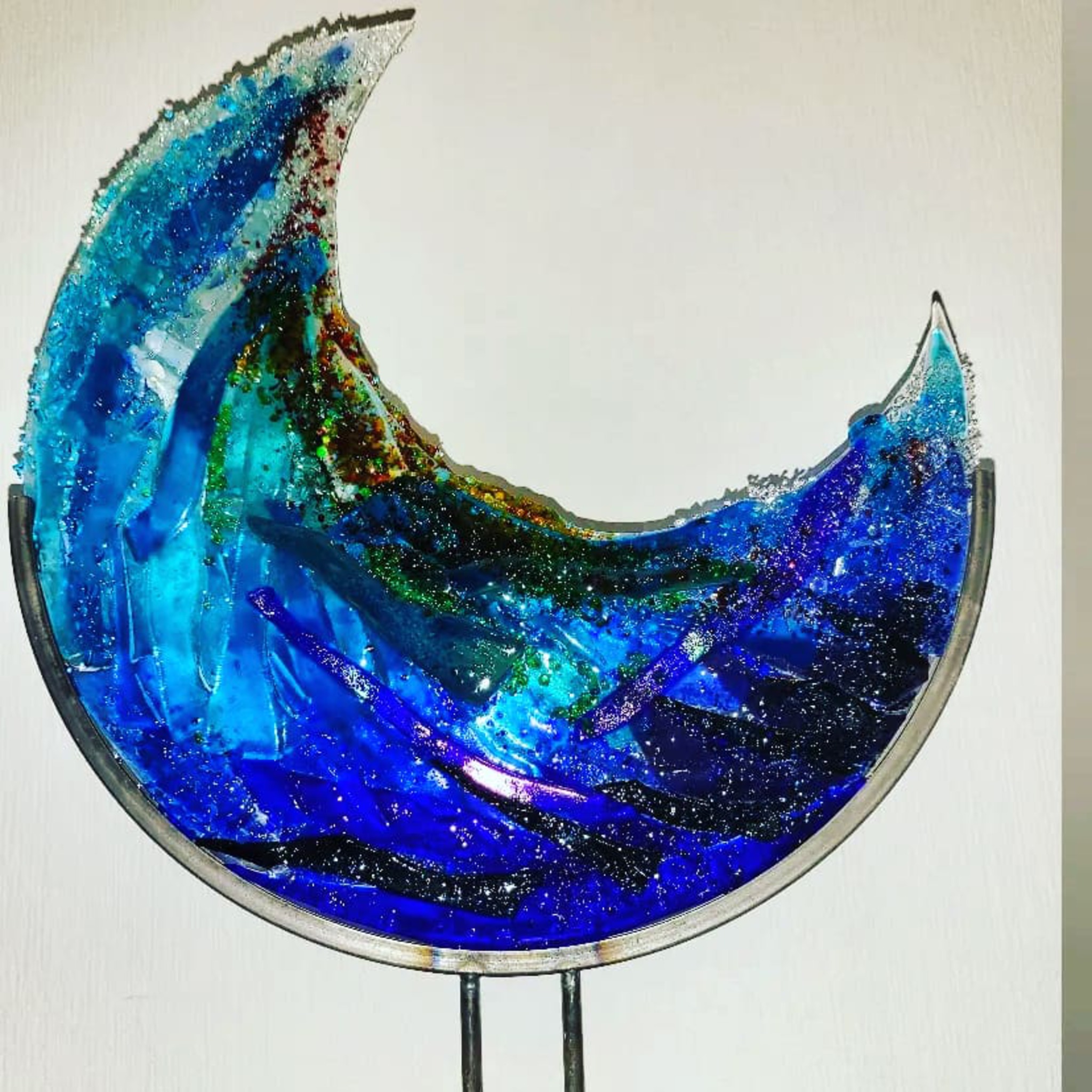 Golf van diverse kleuren blauw, met glinsterende druppels van dichroic glas.