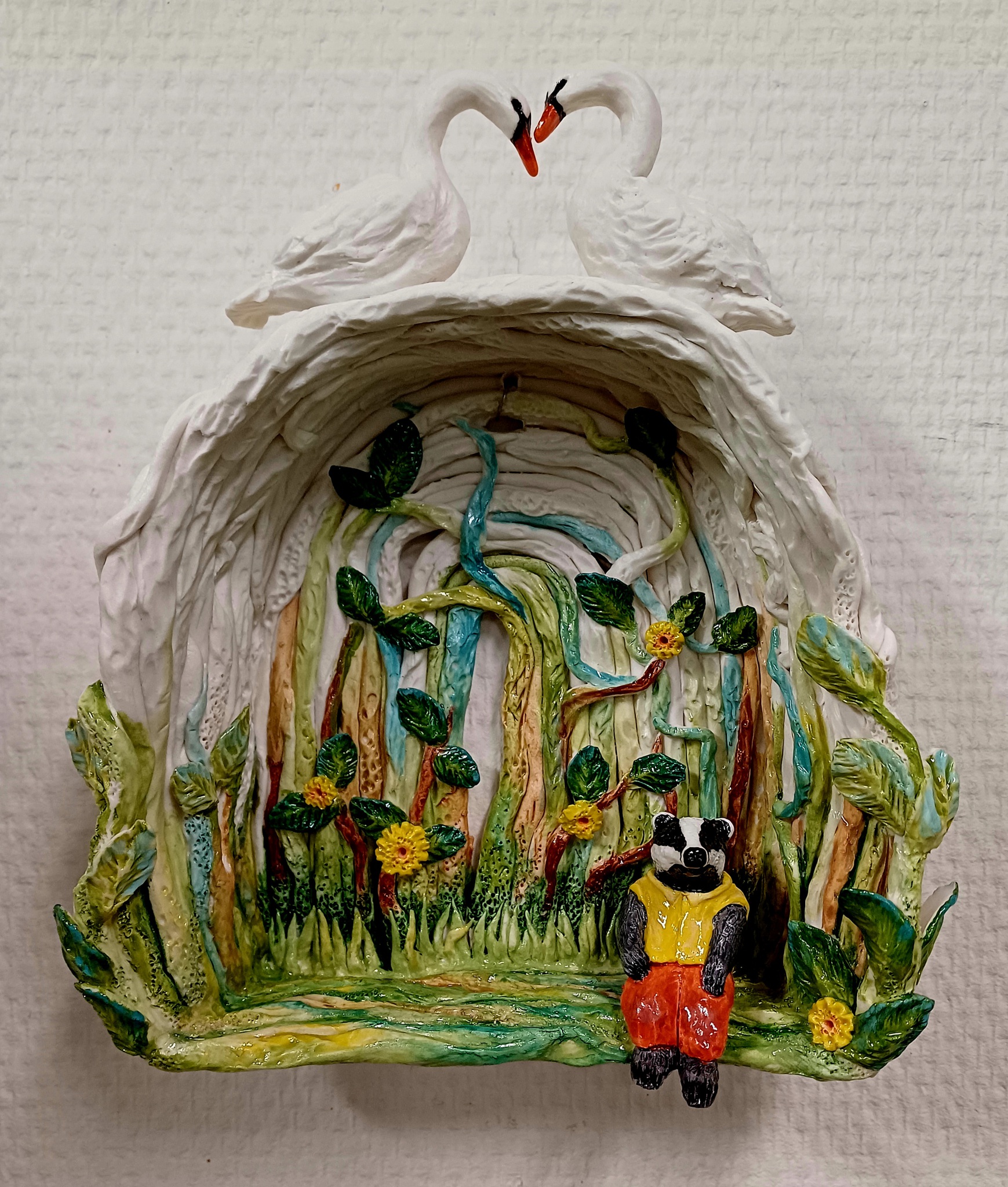 Saskia Van Aubel maakt keramische werkstukken, schilderijen, tekeningen en bloemobjecten van textiel.