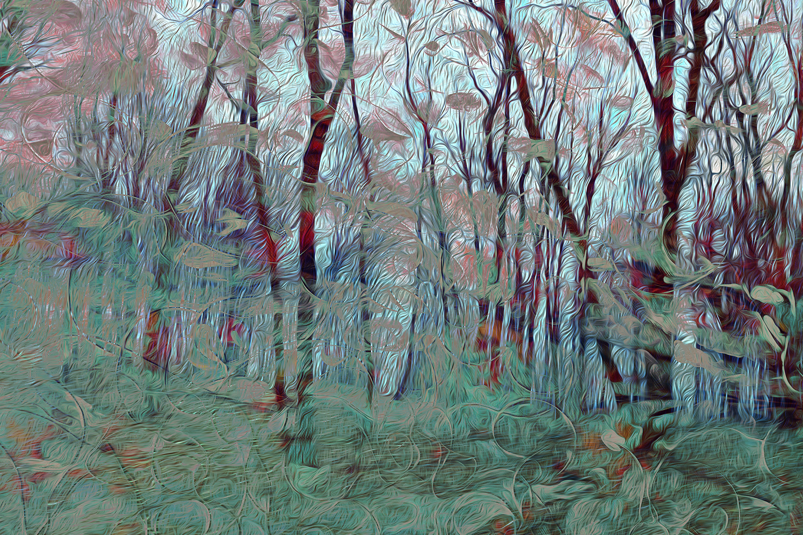 Bomen Bos Ritme Kleur Gelaagd Versluierd Wonder Ontdekken Stroming Stromen Heuvel Dimensies Beschut Rood Landschap Groen Digitaal Mixed Media Beweging Natuur Boom Draad Vormen Wandeling