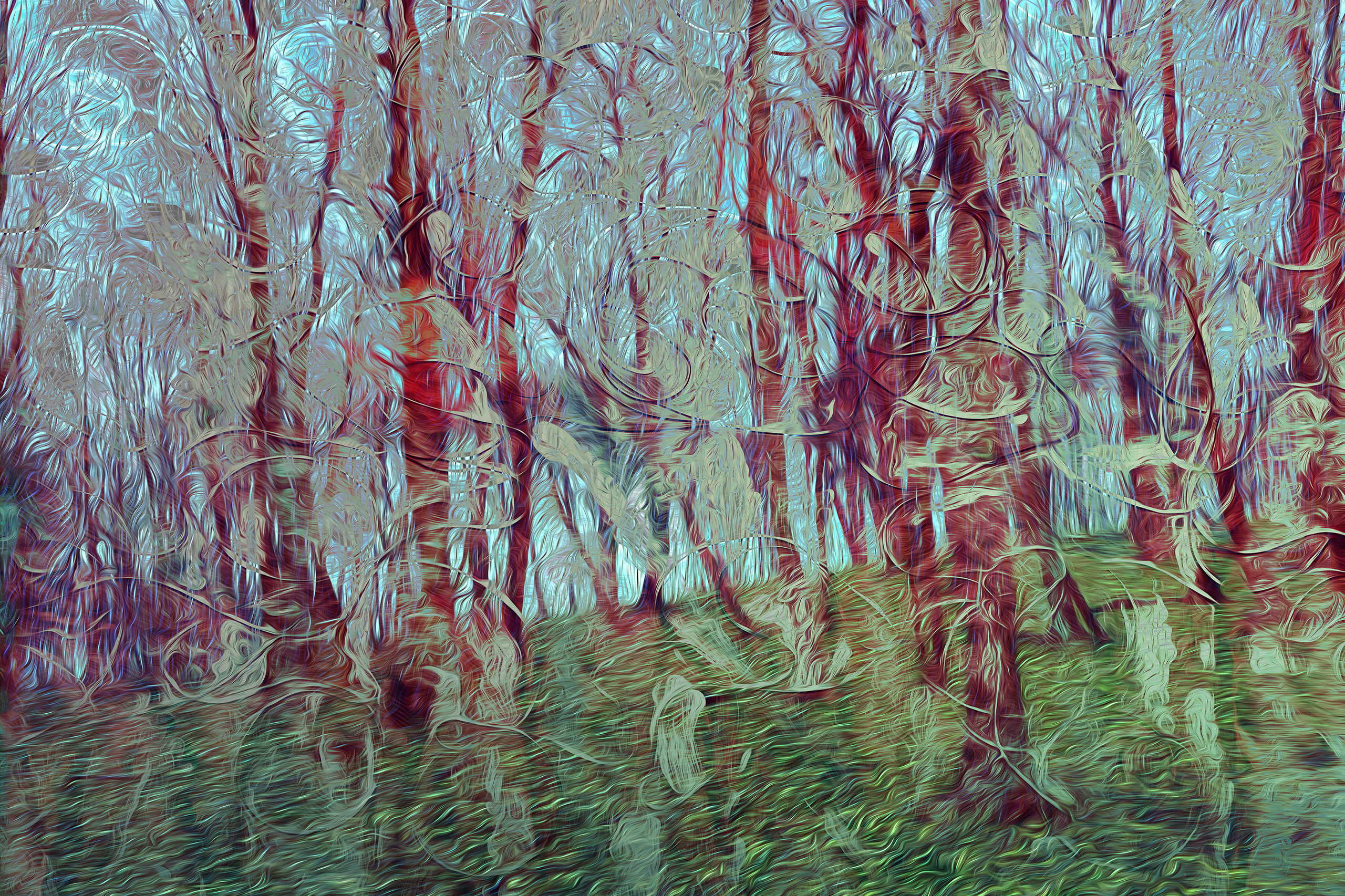 Bomen Bos Ritme Kleur Gelaagd Versluierd Wonder Ontdekken Stroming Stromen Heuvel Dimensies Beschut Rood Landschap Groen Digitaal Mixed Media Beweging Natuur Boom Draad Vormen Wandeling