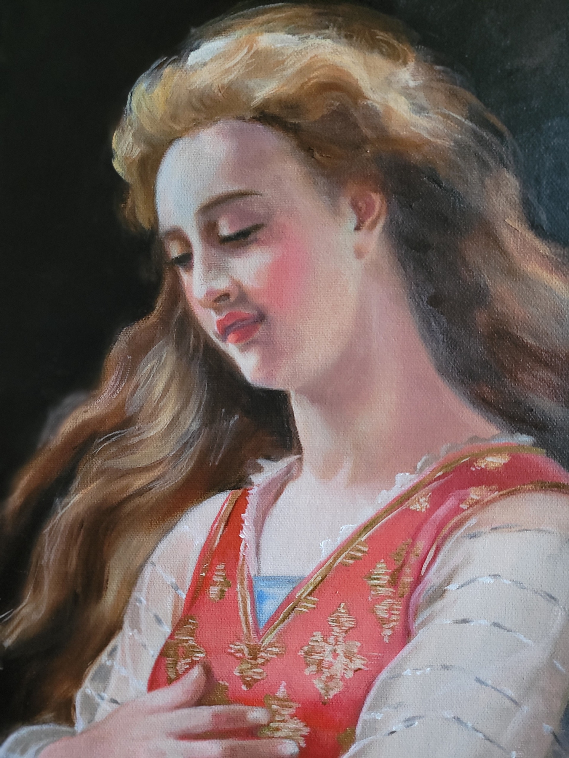 Klassiek portret naar de Franse schilder Hugues Merle. Er gaat een innerlijke rust vanuit. De uitdaging was om het zilver en de doorzichtigheid van de mouwen goed weer te geven. Ingelijst