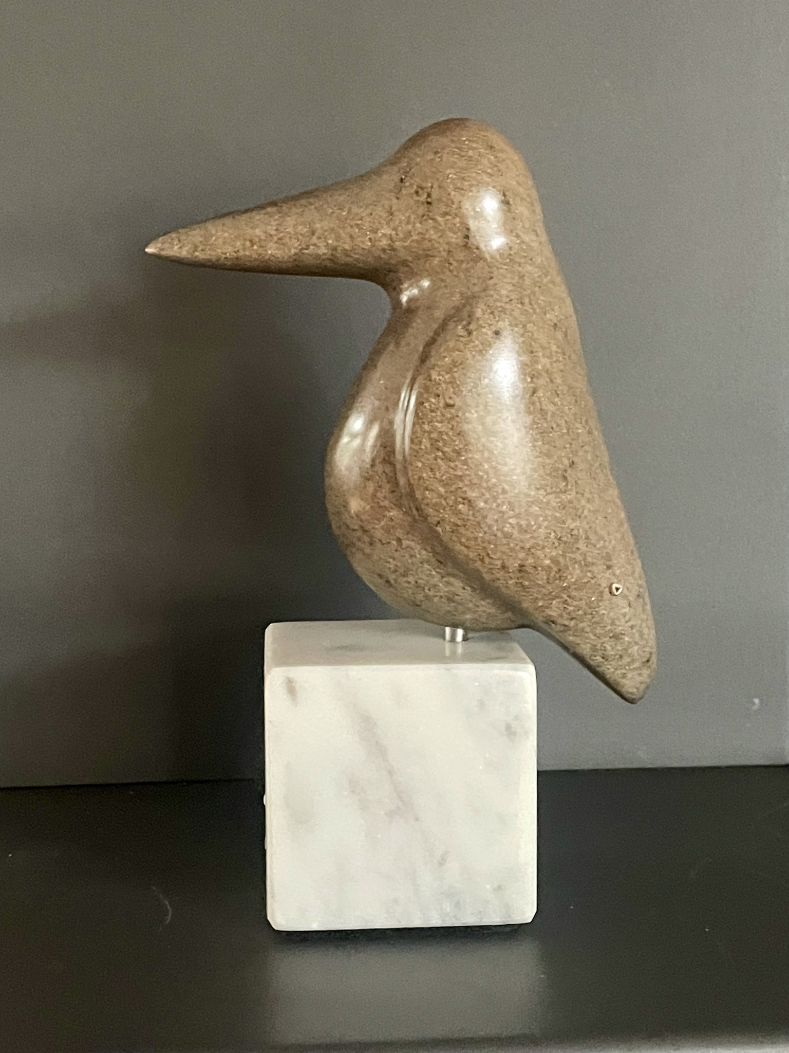 ijsvogel tje uit Braziliaans speksteen gezeten op sokkel van wit marmer