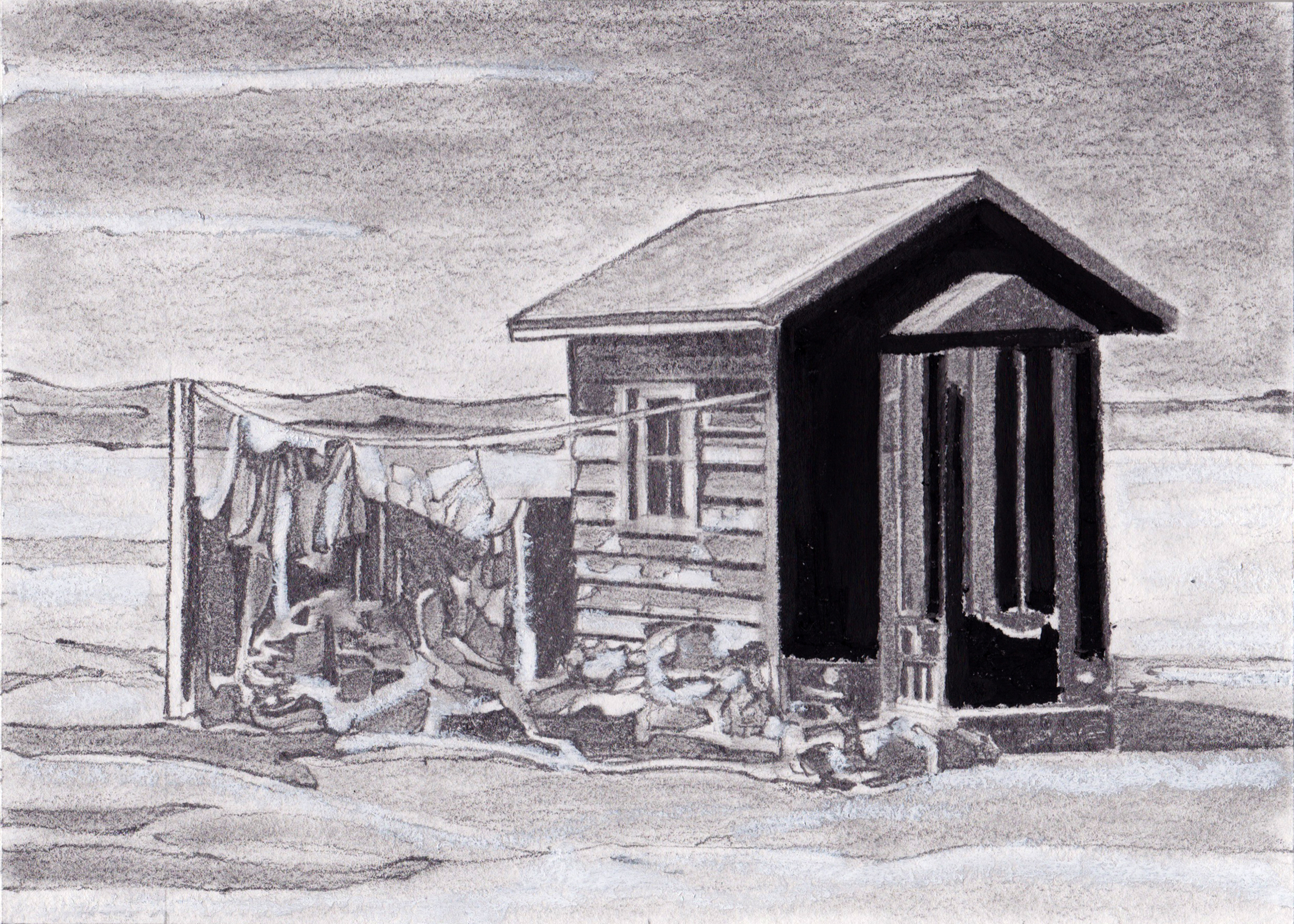 Onderdeel van de serie "house in the middle". Tekening gebaseerd op een film still afkomstig uit de film "The house in the middle" uit 1954. Deze film werd met medewerking van de Amerikaanse overheid geproduceerd door een bedrijf wat verf produceerde, en had als doel mensen te overtuigen dat ze, ten tijden van een atoomoorlog, zelf voorzorgsmaatregelen kunnen nemen, namelijk een opgeruimd en vers geschilderd huis, die minder snel vlam zal vatten, maar uiteraard niet beschermt tegen straling en fall-out. Een vergelijkbare situatie, waarin een dreigende catastrofe wordt gebagatelliseerd en waarin tegelijkertijd iedereen een persoonlijke verantwoordelijkheid wordt opgedrongen (had je het gras maar moeten maaien) is mijns inziens nu gaande met het mantra korter douchen met het oog op de klimaatverandering. "The dingy house on the left. The dirty and littered house on the right. Or the clean, white house in the middle. It is your choice. The reward may be survival."