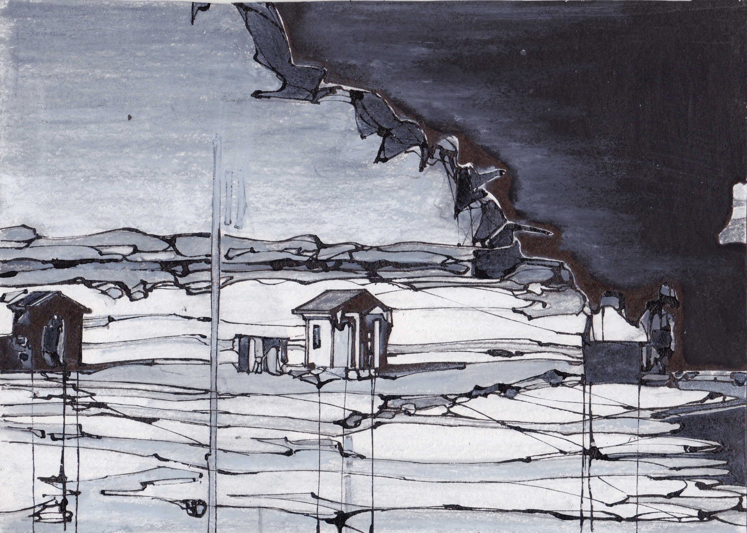 Onderdeel van de serie "house in the middle". Tekening gebaseerd op een film still afkomstig uit de film "The house in the middle" uit 1954. Deze film werd met medewerking van de Amerikaanse overheid geproduceerd door een bedrijf wat verf produceerde, en had als doel mensen te overtuigen dat ze, ten tijden van een atoomoorlog, zelf voorzorgsmaatregelen kunnen nemen, namelijk een opgeruimd en vers geschilderd huis, die minder snel vlam zal vatten, maar uiteraard niet beschermt tegen straling en fall-out. Een vergelijkbare situatie, waarin een dreigende catastrofe wordt gebagatelliseerd en waarin tegelijkertijd iedereen een persoonlijke verantwoordelijkheid wordt opgedrongen (had je het gras maar moeten maaien) is mijns inziens nu gaande met het mantra korter douchen met het oog op de klimaatverandering. "The dingy house on the left. The dirty and littered house on the right. Or the clean, white house in the middle. It is your choice. The reward may be survival."