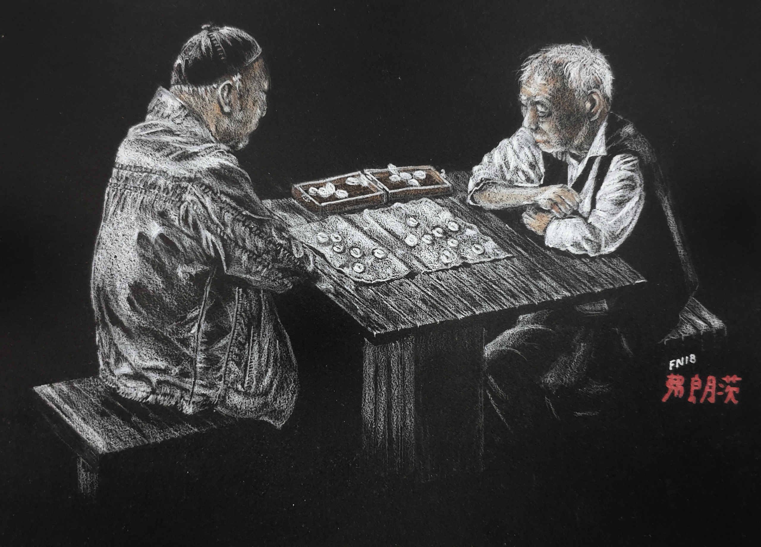 Op de foto is het niet te zien, maar in het 'Peoples Park' in Shanghai was het super druk. Toch zaten deze twee mannen in hun kleine 'GO wereldje’. Op dit kleine 'low key' schilderijtje kon ik dat extra accentueren. Door alleen de lichtvlakken te tekenen vul je met je brein de vormen van de objecten in.
