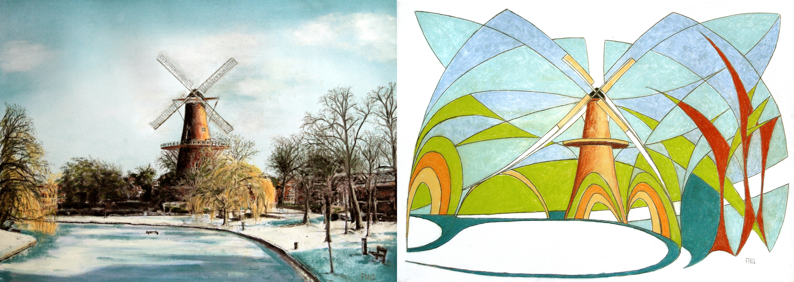 De contè schilderijen van de waterpartij achter de molen 'de Valk' in Leiden vormde een goede herinnering voor mijn goede vrienden Annalisa en Philippo die naar Londen verhuisden. Ik vroeg mij af, waarom vind ik een schilderij mooi. Dus ben ik gaan spelen met het lijenspel van een realistisch schilderij. Dus heb ik het realistische schilderij vertaald naar lijnen em kleuren. Daardoor ontstond deze abstracte tekening.