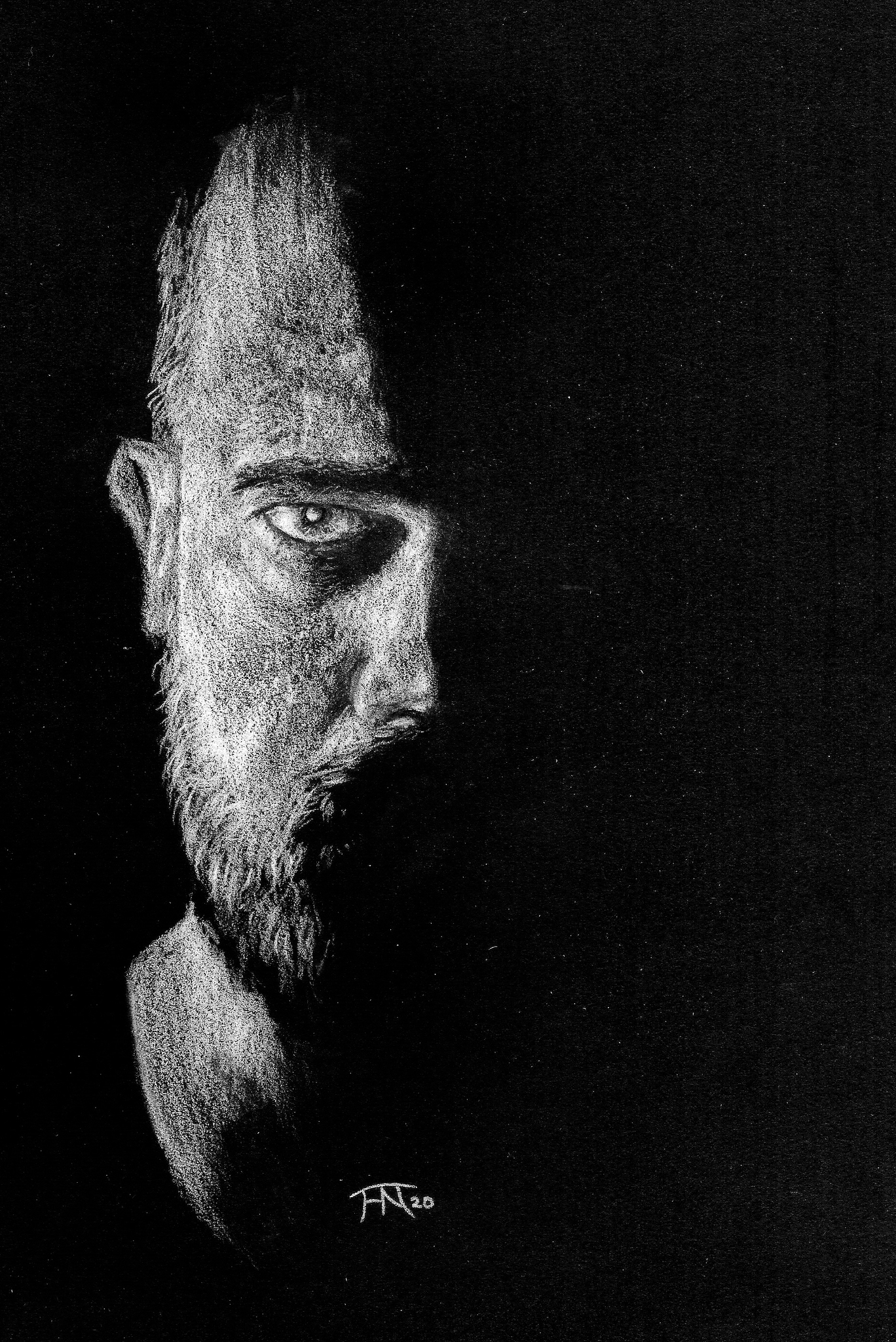 Een pastel schilderij van een man. De low key foto, die ik als thema koos, heb ik niet zelf gemaakt maar van het internet gehaald. In die periode oefende ik veel met low key portret fotografie. Het schilderijtje is een leuke oefening in het spelen met weing licht.