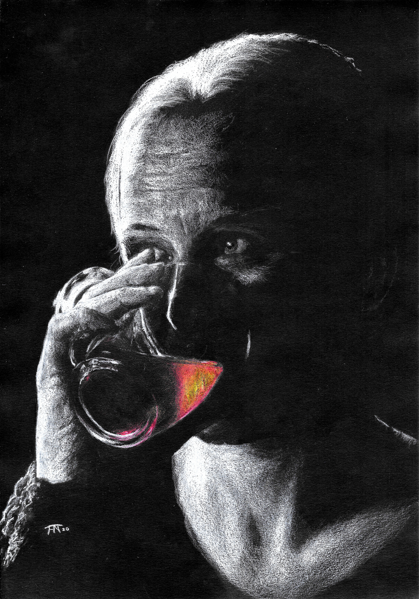 Mijn schoondochter Kirstin drinkt een kopje thee. Het werken met wit pastel op zwart papier is een schitterende oefening voor het schilderen van lichte partijen op een donkere achtergrond. Ik heb expres alleen kleur gebruikt in het theekopje.