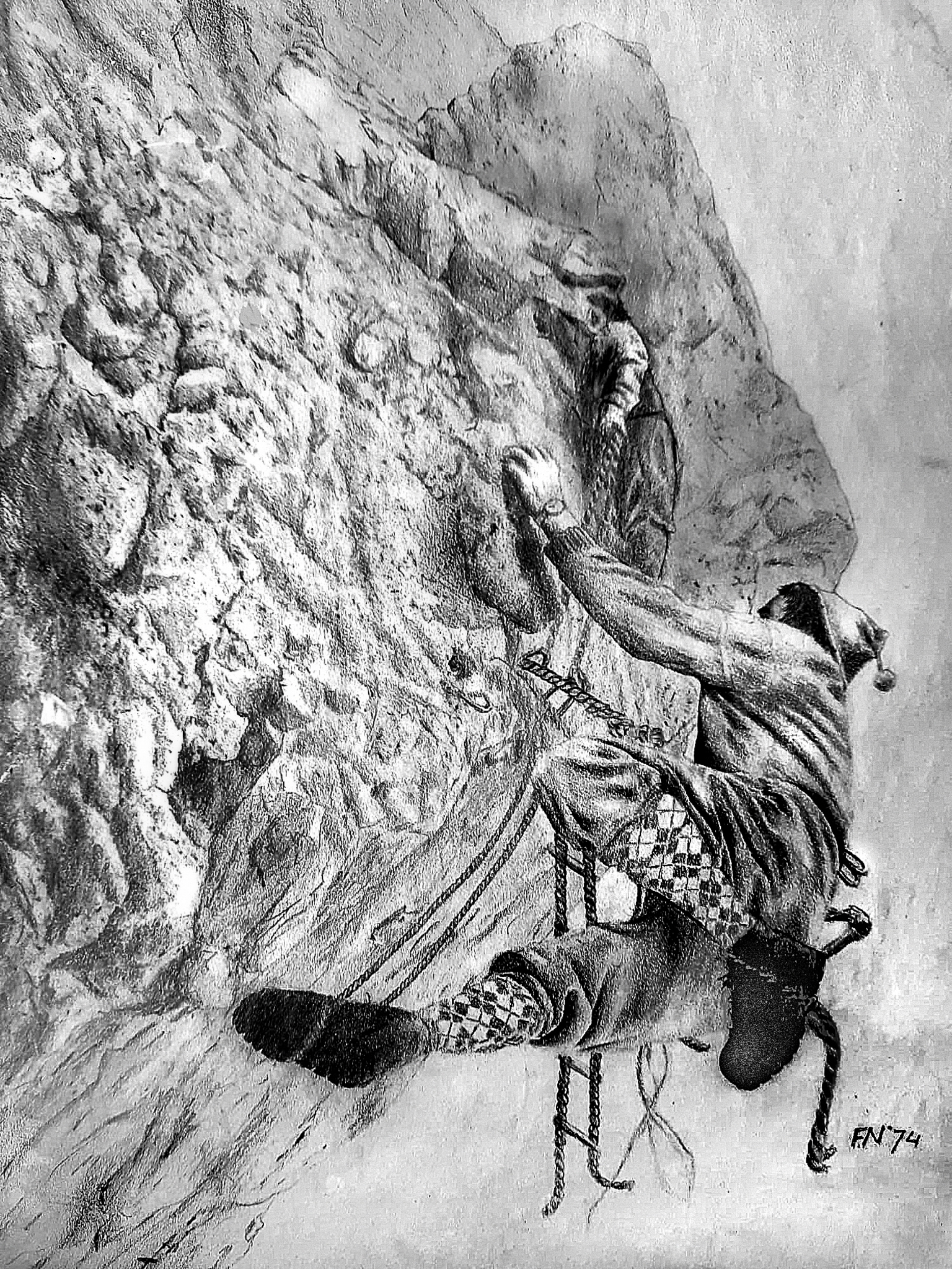 Pas dit jaar werd ik weer geconfronteerd met deze potloodtekening uit 1974. Het zijn bergbeklimmers en ik heb het gemaakt toen ik nog, in de zomermaanden, aktief met mijn broers en vrienden in Zwitserland deze sport beoefende.