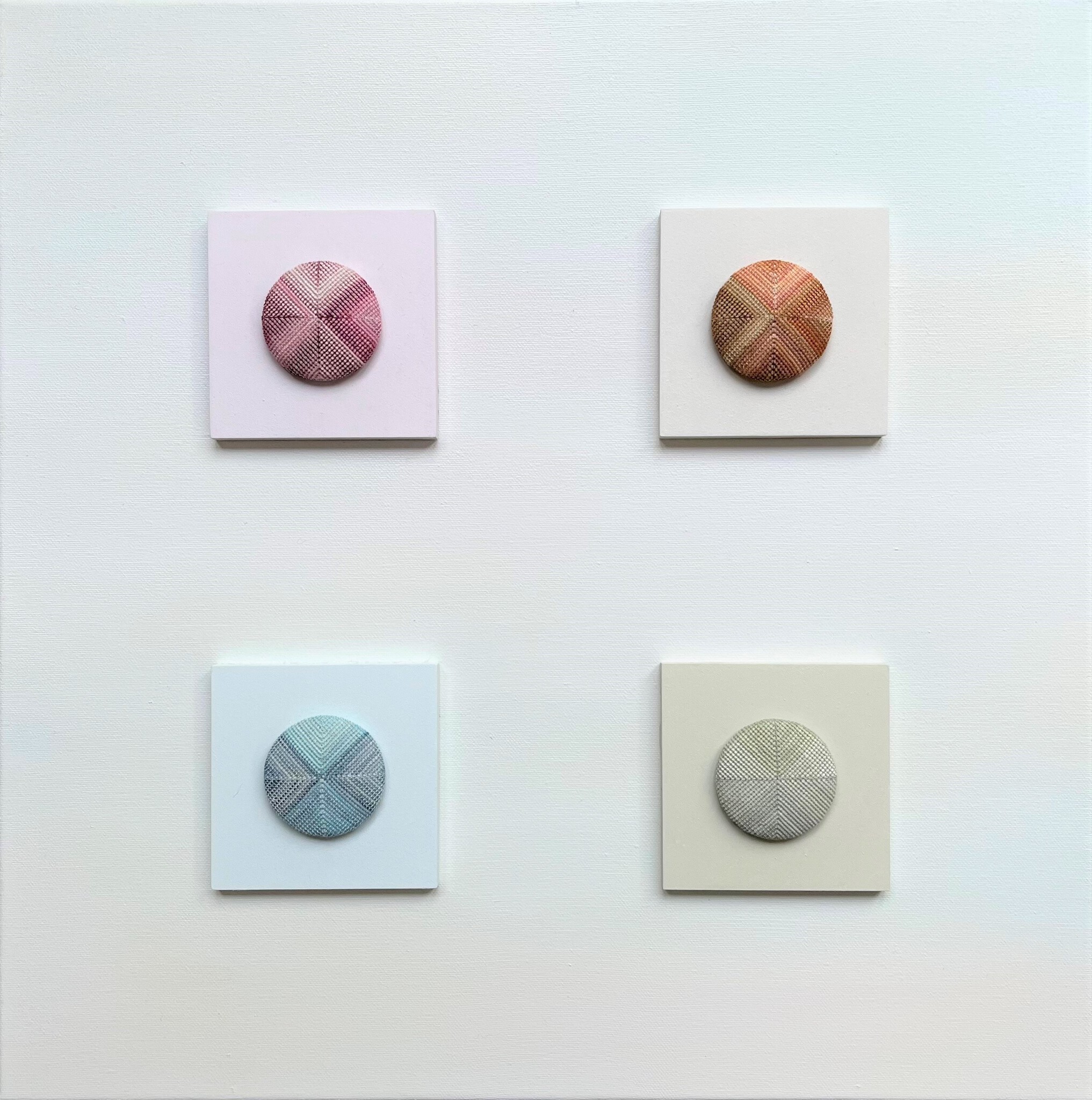 Combinatie van acrylverf in pasteltinten op doek en vier mus-panelen. Op de panelen borduurwerk op houten knopen.