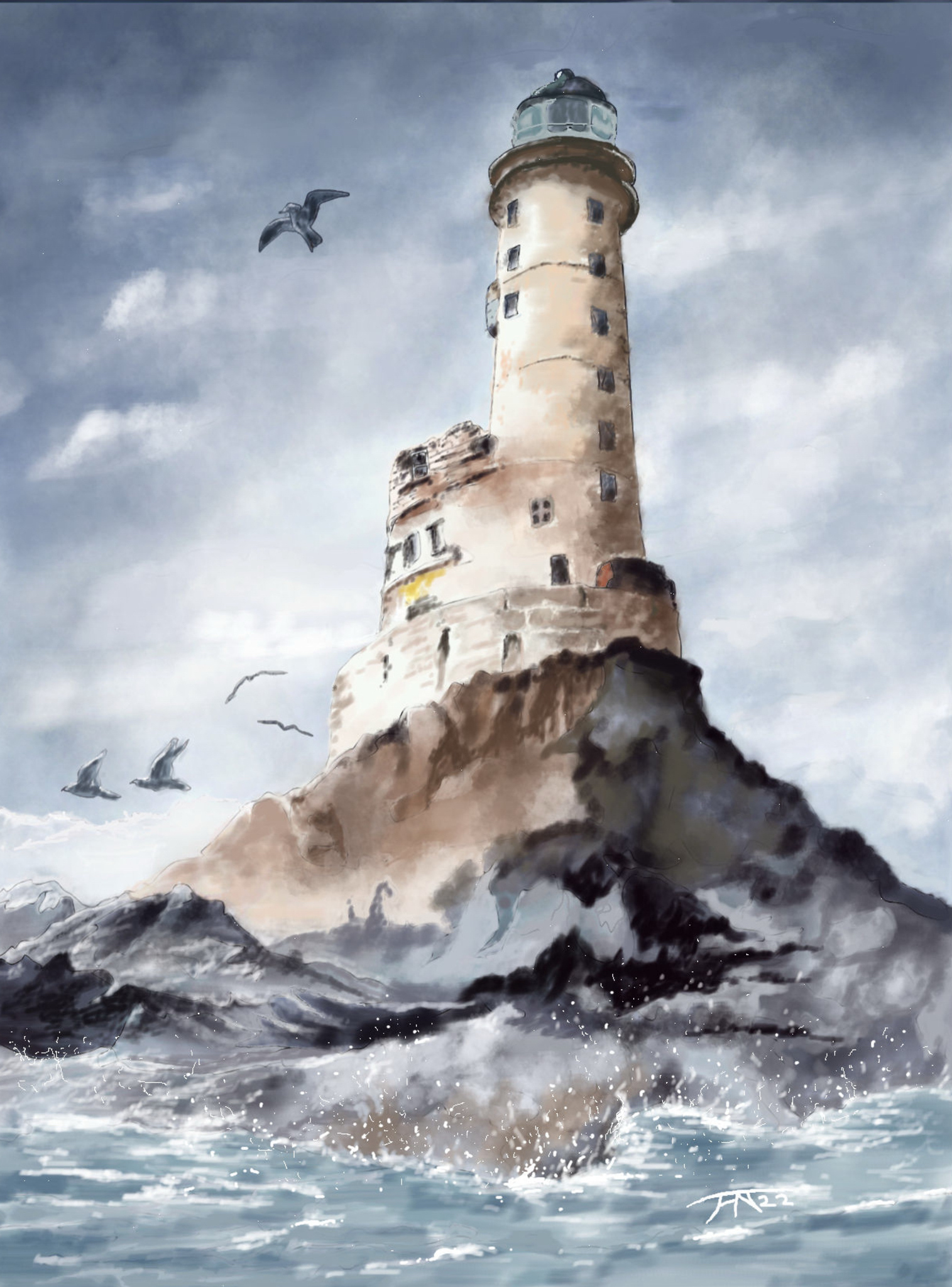 In dit digitaal schilderijtje staat een fraaie vuurtoren. Ik heb het naar voorbeeld met brushtecnieken op de computer gemaakt.