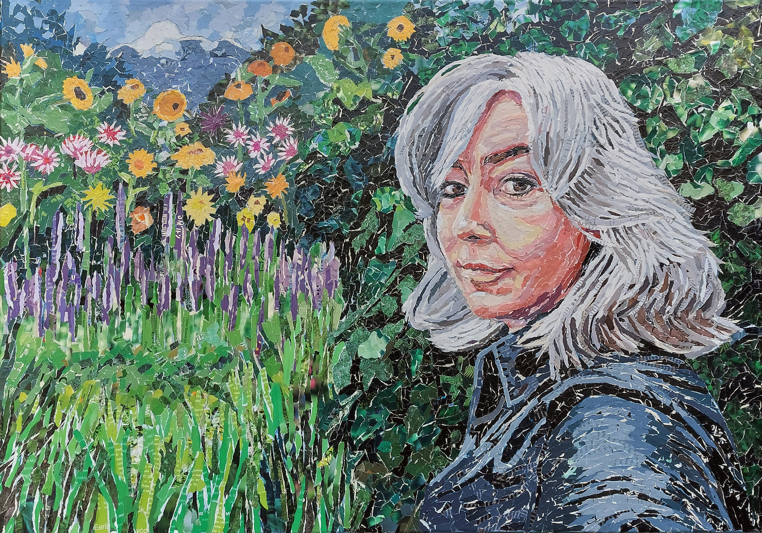 And into the garden I go, to loose my mind and find my soul. Papiersnippers op doek. Inspiratieplek: mijn eigen tuin.