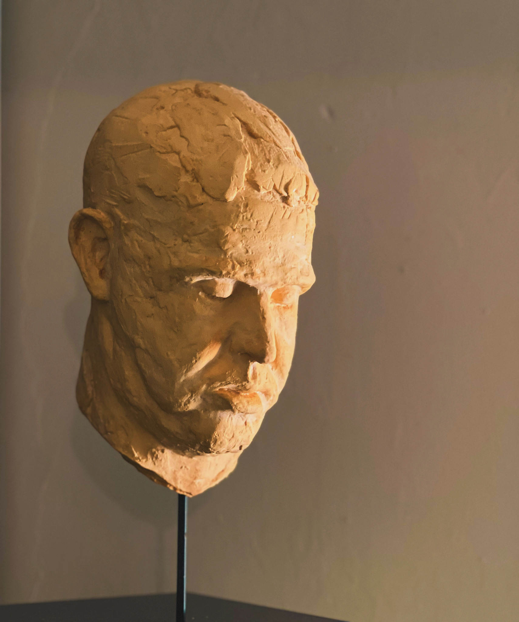 Heb je ooit het exacte moment gevoeld net voordat je in slaap viel? Ook als je helemaal niet wilde slapen, elke keer je hoofd weer omhoog knikken? Deze jongeman deed heel erg zijn best om wakker te blijven, maar gelukkig voor Helga faalde hij… Dit beeldhouwwerk lijkt bijna op een ruwe diamant die nog niet volledig is geslepen en gepolijst. De onregelmatigheden en textuur op het oppervlak geven het een gevoel van authenticiteit en rauwe schoonheid. De subtiele details, zoals de scherpe lijnen van de kaak en de zachte welvingen van de lippen, vangen de essentie van de menselijke expressie in een moment van verstilling. De gele tint van het materiaal straalt warmte uit, terwijl de zwarte sokkel een contrast vormt dat het hoofd doet oprijzen als een monument van ingetogen kracht. Deze sculptuur straalt een gevoel van tijdloze elegantie en diepgang uit, en nodigt de kijker uit om de complexiteit en diversiteit van de menselijke geest te verkennen. De kop is gemaakt van oranje gepigmenteerd plasticrete, een synthetisch gips. De arduinen sokkel is met een ijzeren staaf verbonden met het beeld.