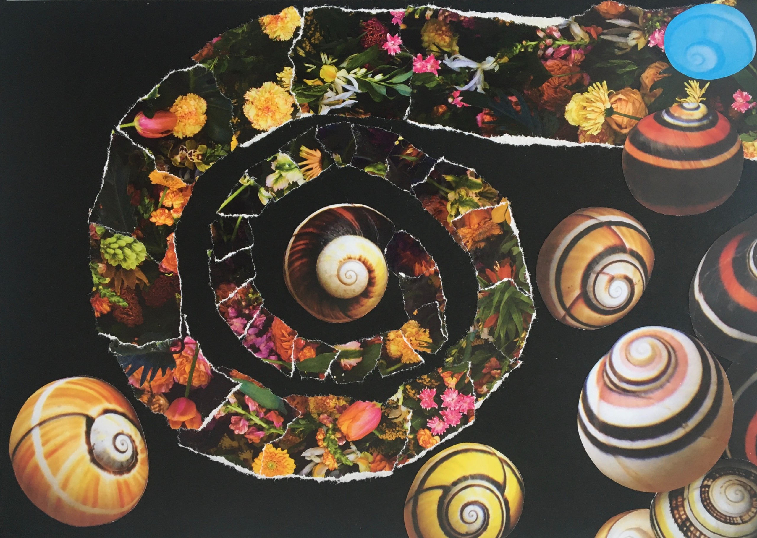 Bloemen Slakken Ruimte Zwart Spiraal Collage Papier Verhalend Surreeel Papierkunst Lijm Schaar Spiritueel Collagecoaching Coach Interpreteren Vertalen Papierkunstenaar Intuïtief Flow Kleurig Bewegend Positief Boodschap Kunstenaar